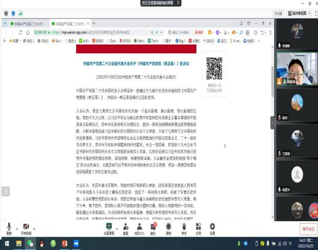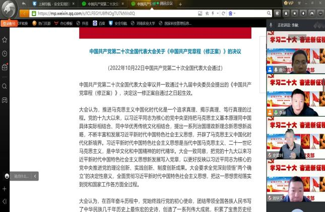为深入学习贯彻党的二十大精神、感悟思想伟力、汲取奋进力量,10月25日下午,根据疫情防控要求,91社区 各教工支部于线上举行了党的二十大精神学习会议,各教工支部党员及全体教师参加学习,院党委委员以普通党员身份参加支部学习。