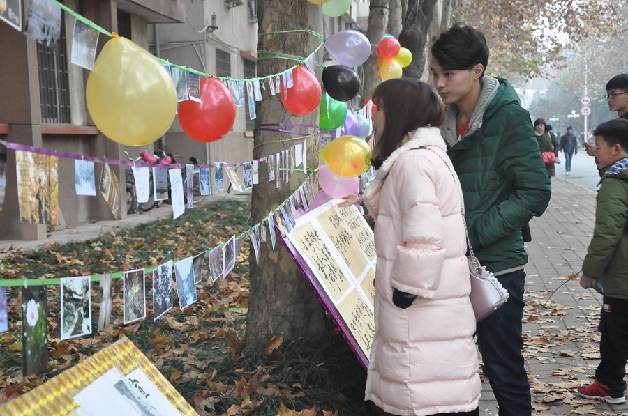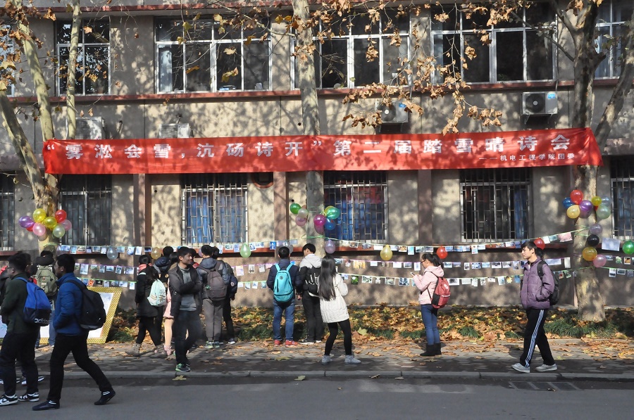 中午12点整,迎着冬日的暖阳,活动如火如荼地开始了。院办旁的道路边挂满了老师和同学们的诗作和摄影作品,引得过路的行人频频驻足观看。中午12点30分,院团委老师一行来到院办楼下,观看过同学们的作品后,老师们都赞不绝口,感叹于机电人的才华横溢。16级推免生辅导员杨航老师更是当场挥毫创作出几幅书法作品,使得同学们不禁拍手赞叹。