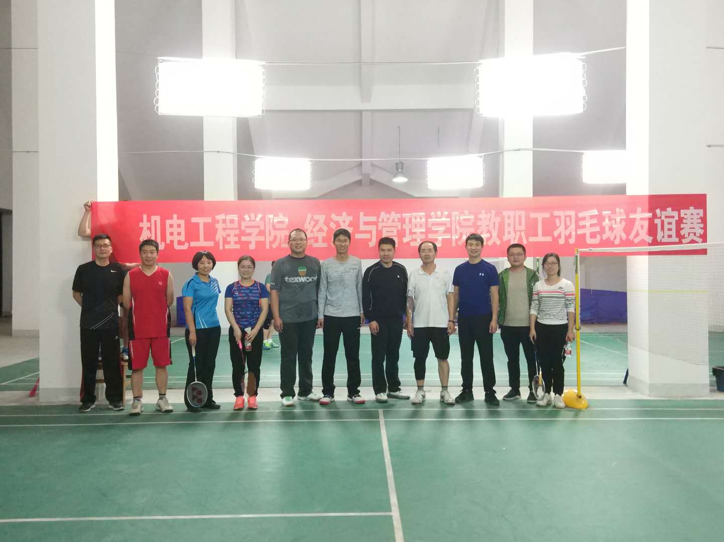 教职工代表在院党委书记李世欣的带领下,应邀与经济管理院教职工羽毛球队在龙子湖校区教学楼E座五楼羽毛球场举行羽毛球友谊赛。