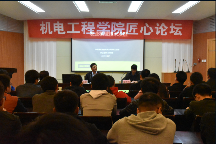张和锋从国内外拖拉机的技术发展讲起,从运输速度、安全性、维护保养三个方面向同学们进行了详细的阐释,同时还介绍了发动机、传动系和车架、液压系统技术的发展。随后,张和锋向大家介绍了国外拖拉机的产品技术。他指出,国外拖拉机产品更加丰富,功能更加完备,我国国产的拖拉机设备和国外相比仍有一定距离,希望同学们在自己的大学生涯里能够努力的汲取知识,将来为祖国的农机事业做出自己的贡献。会议最后,张和锋亲切的回答了同学们提出的问题,并和同学们进行了合影。
