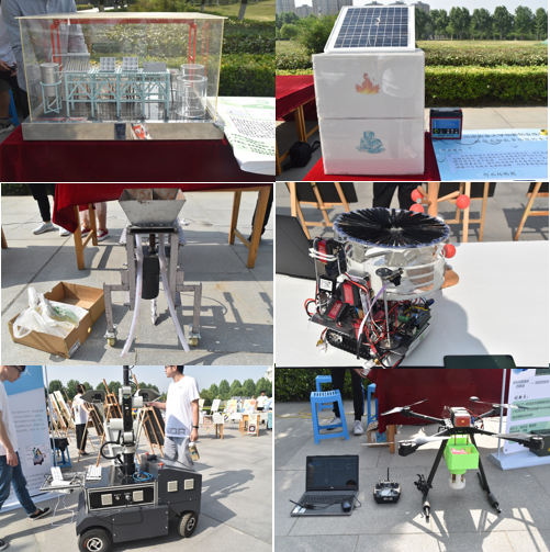 展示的项目主要是科技创新成果及创新创业部分竞赛获奖作品。包括“大中型连续式生物质光合细菌制氢成套装置”、“新型太阳能多功能外卖箱”、“仿形蜂窝煤烟草专用施肥机”、“双目视觉化采摘机器人”、“双机械臂果树采摘机器人”、“基于多旋翼无人机平台的赤眼蜂投放装置”等六个项目,内容丰富的参展成果吸引了众多师生,活动现场,各位领导认真了解学生作品,详细询问创意来源和应用前景,关心同学们在研究过程中遇到的困难与问题,鼓励同学们迎难而上,并以专业学习为基础,提出更贴近实际需求,具有实际效益的科技产品,努力成为有理想、有学问、有才干的实干家,更好为国争光、为民造福。