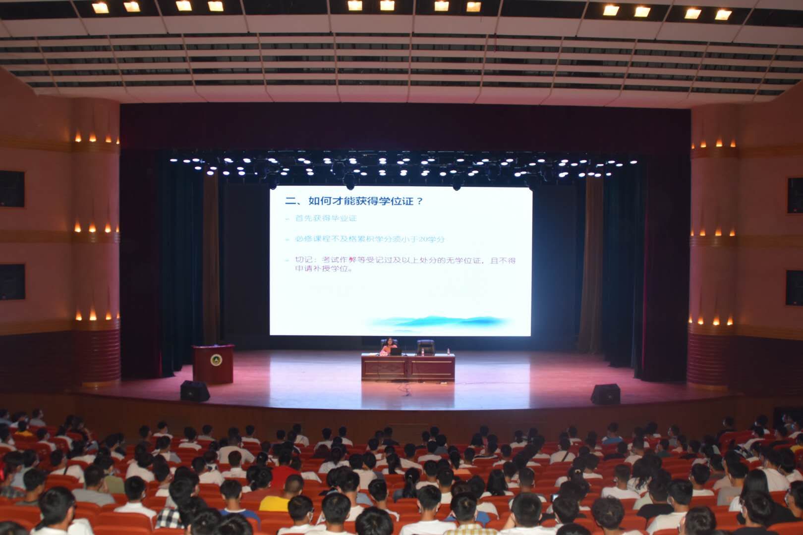 邀请院教学干事吴丽美在千人大礼堂作“新生入学教育系列——学业学籍管理”教育讲座。团委老师徐捧丽、各专业辅导员及2020级全体新生参加讲座。