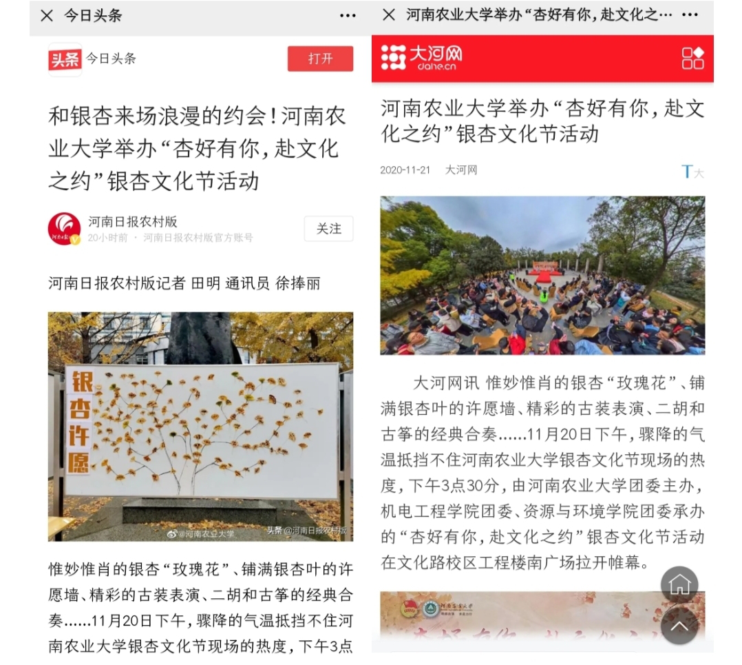 《河南日报》、《郑州日报》、《大河网》、《大象新闻》等多家媒体均报道了此次银杏文化节活动,以网络互动形式让更多人了解到银杏文化节,弘扬宝贵的中华银杏精神,增强文化自信。