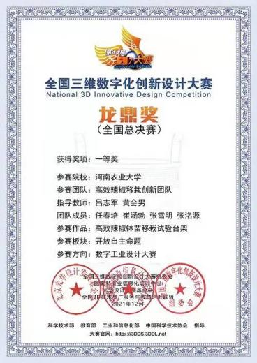 吕志军、黄会男老师指导的“高效辣椒移栽创新团队”(本科生队员:任春培、崔涵勃、张雪明、张洺源)凭借作品《高效辣椒钵苗移栽试验台架》取得大赛(数字工业方向)一等奖,由91社区