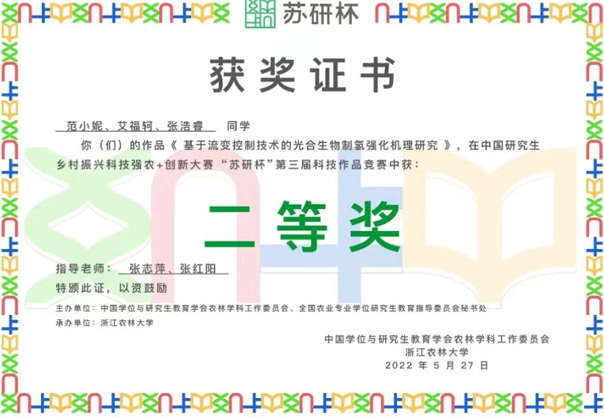 研究生导师张志萍和张红阳指导的硕士研究生范小妮、艾福轲、张浩睿团队作品《基于流变控制技术的光合生物制氢强化机理研究》荣获自然科学类作品二等奖。