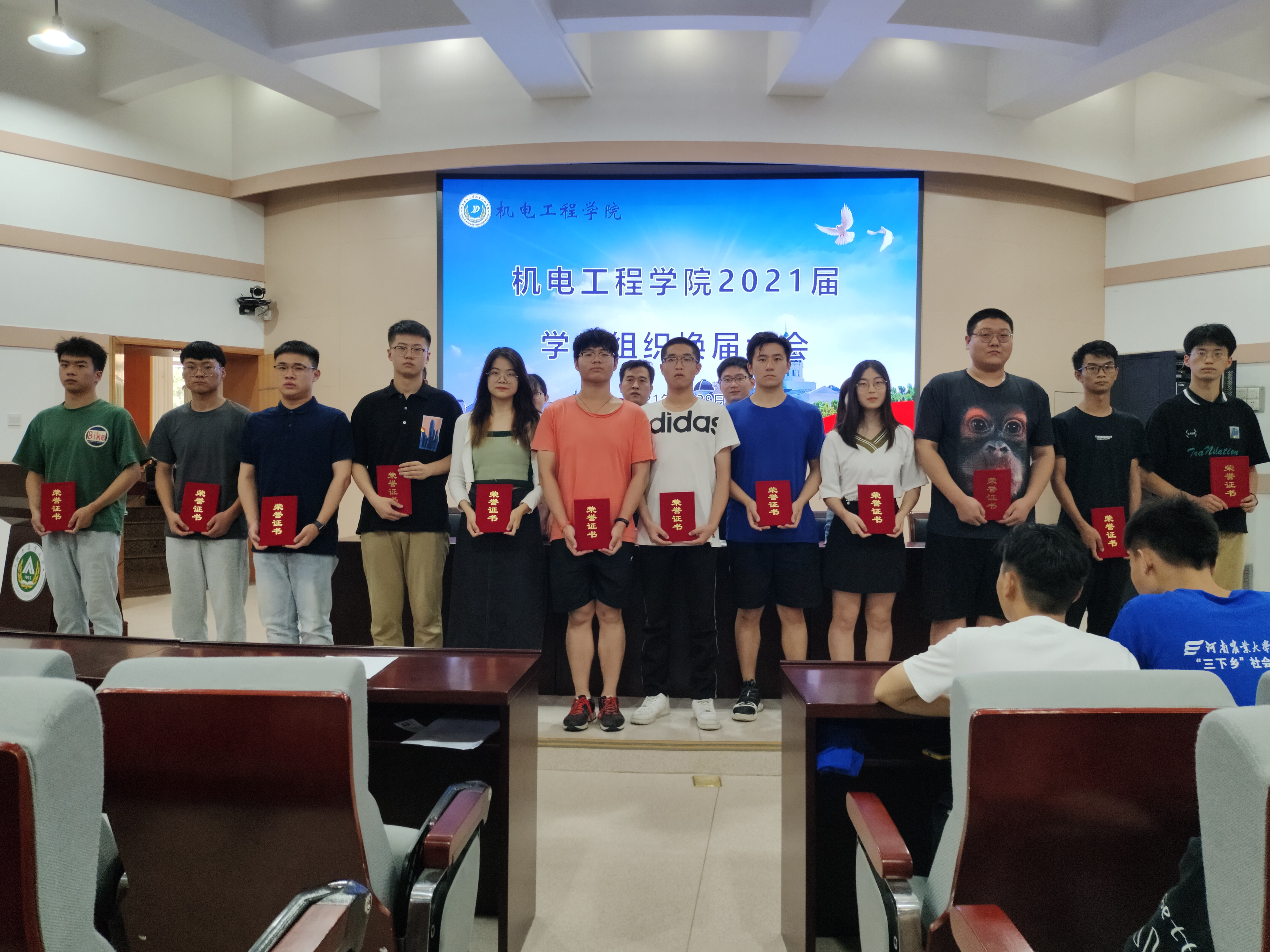 领导老师为新一届学生组织代表颁发聘书并合影留念。