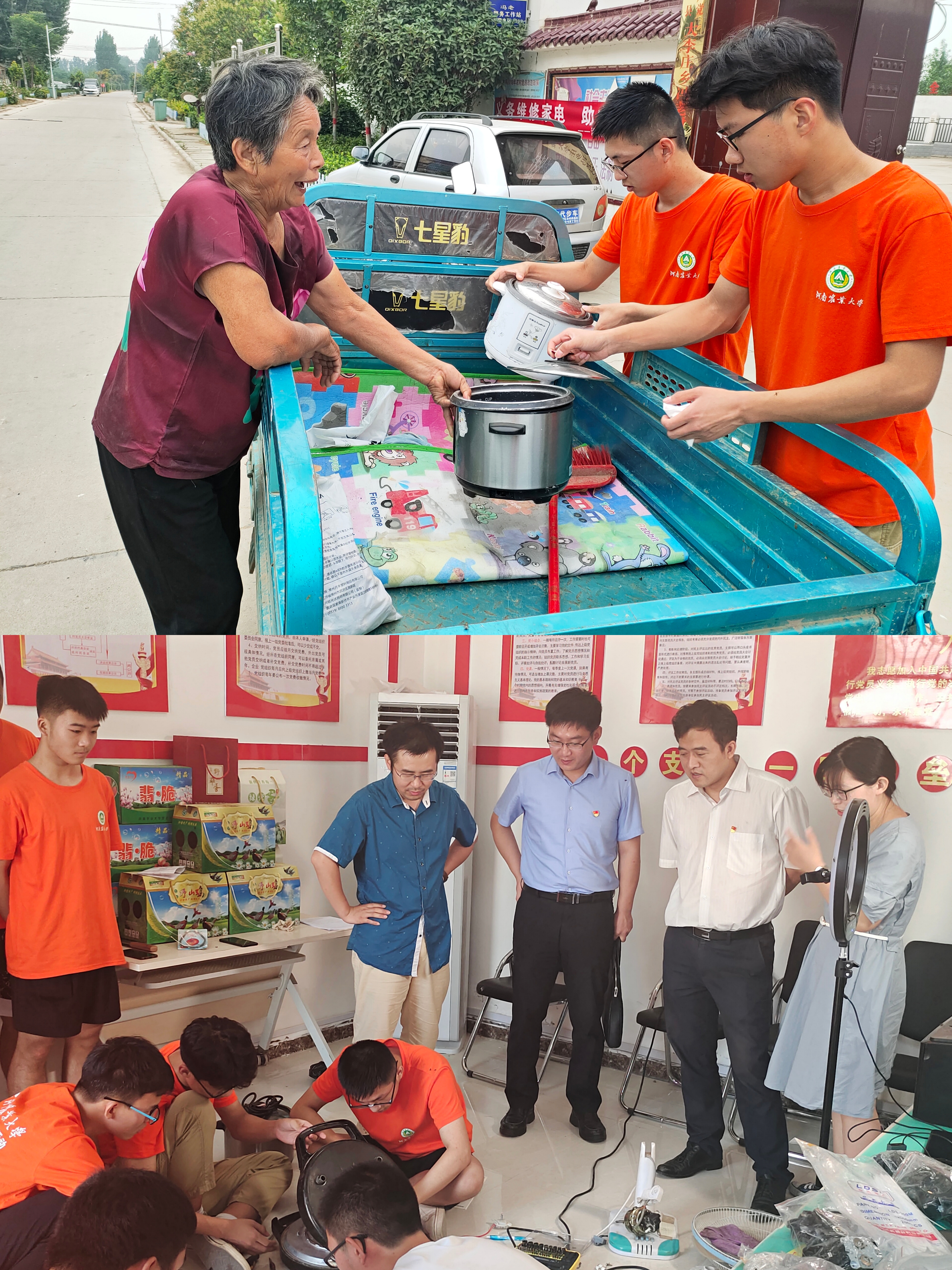当天上午,实践团队抵达扶沟县冯老村,开展义务家电维修活动。居民们络绎不绝地拿着损坏的电风扇等家用电器,前来维修现场进行登记维修。队员们热情接待每一位前来询问的居民,为他们解答有关此次义务家电维修的活动内容及具体时间,并与前来维修的居民们亲切交流。