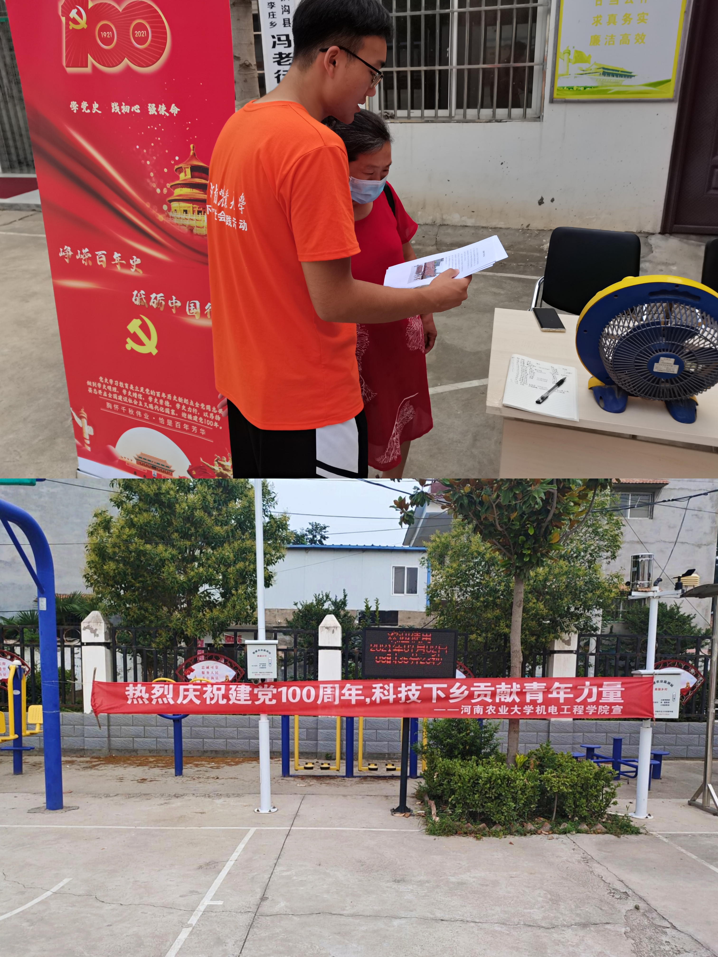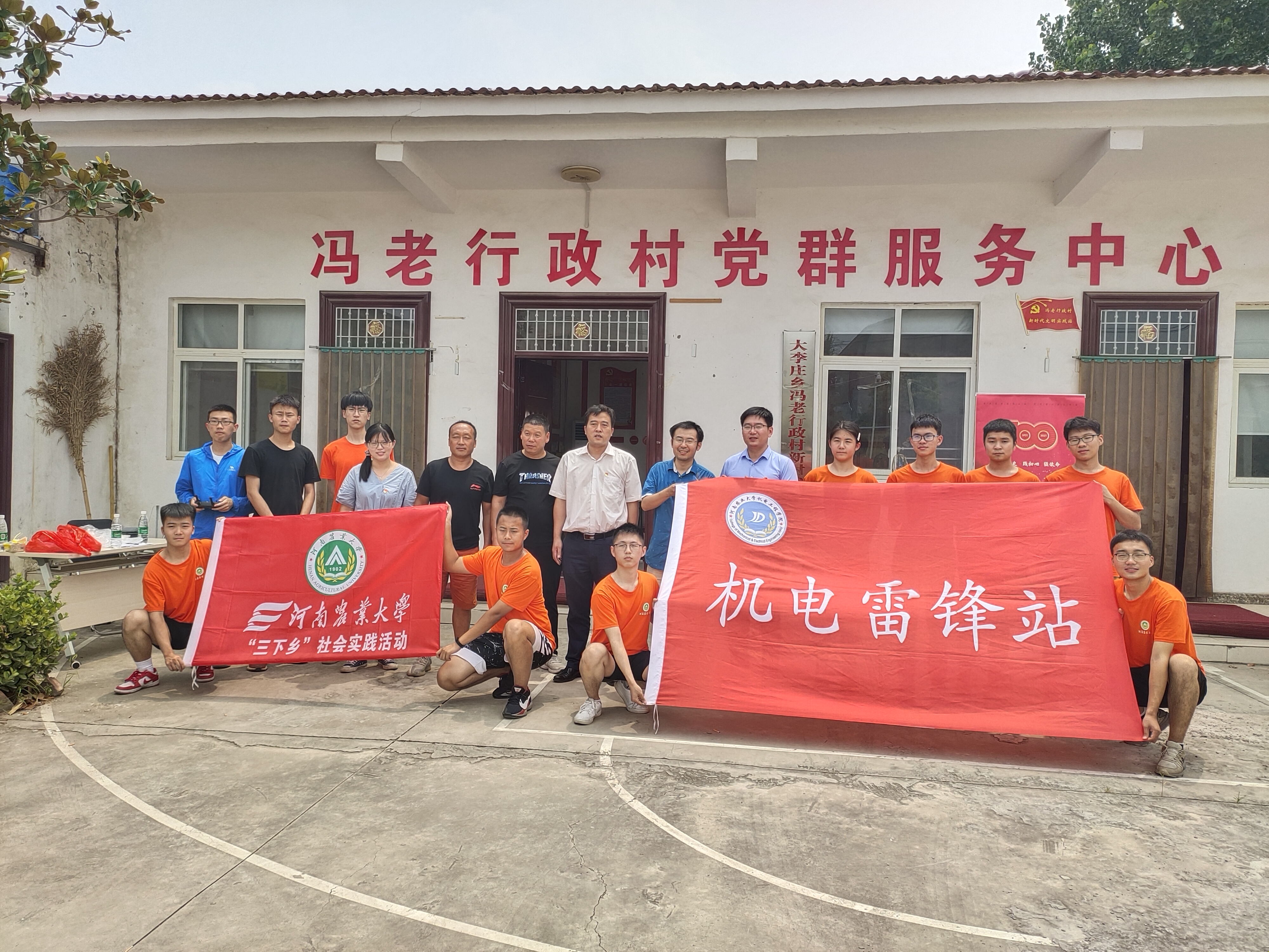 党委副书记赵宁、团委书记黄笑、团委副书记徐捧丽等领导老师来到周口扶沟县冯老村,带队开展以“热烈庆祝建党100周年,科技下乡贡献青年力量”为主题的暑期“三下乡”大学生社会实践活动。