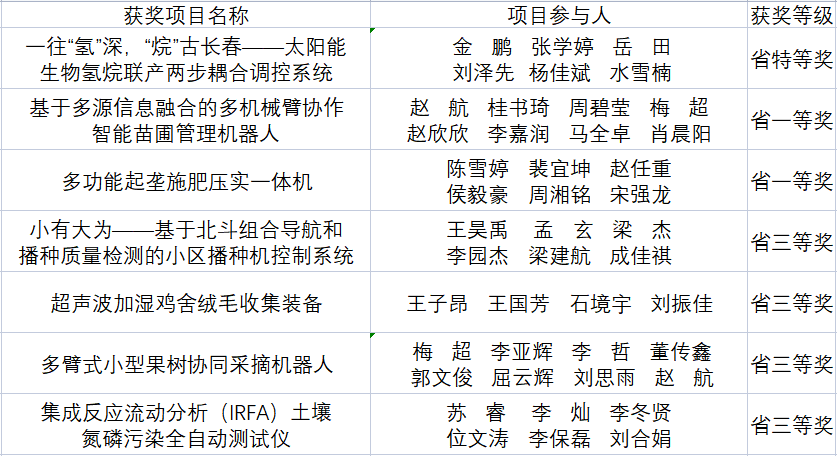 其中,91社区 参赛作品《一往“氢”深,“烷”古长春——太阳能生物氢烷联产两步耦合调控系统》获评特等奖,《基于多源信息融合的多机械臂协作智能苗圃管理机器人》和《多功能起垄施肥压实一体机》获评一等奖,《小有大为——基于北斗组合导航和播种质量检测的小区播种机控制系统》等四项作品获评三等奖。