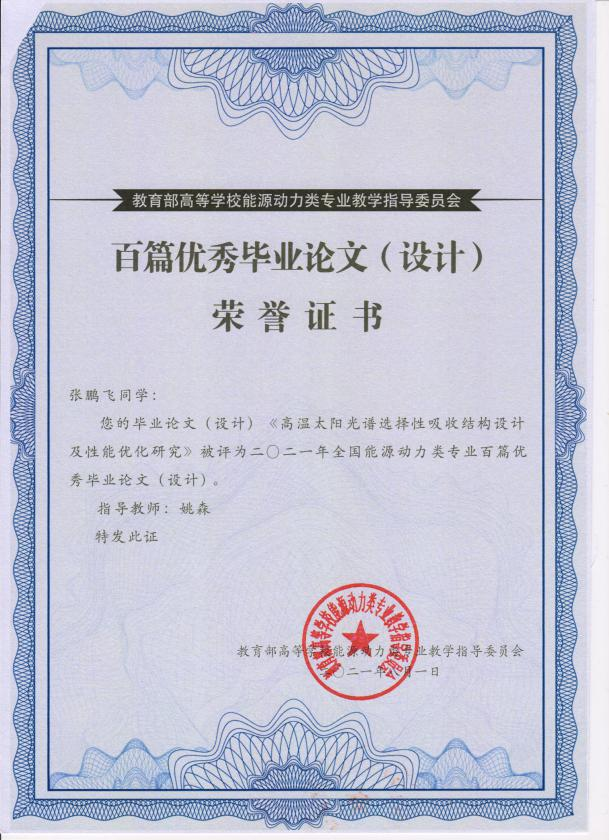2017级能源与动力工程专业学生张鹏飞的本科毕业论文“高温太阳光谱选择性吸收结构设计及性能优化研究”荣获全国能源动力类专业百篇优秀本科论文(设计),指导教师为91社区