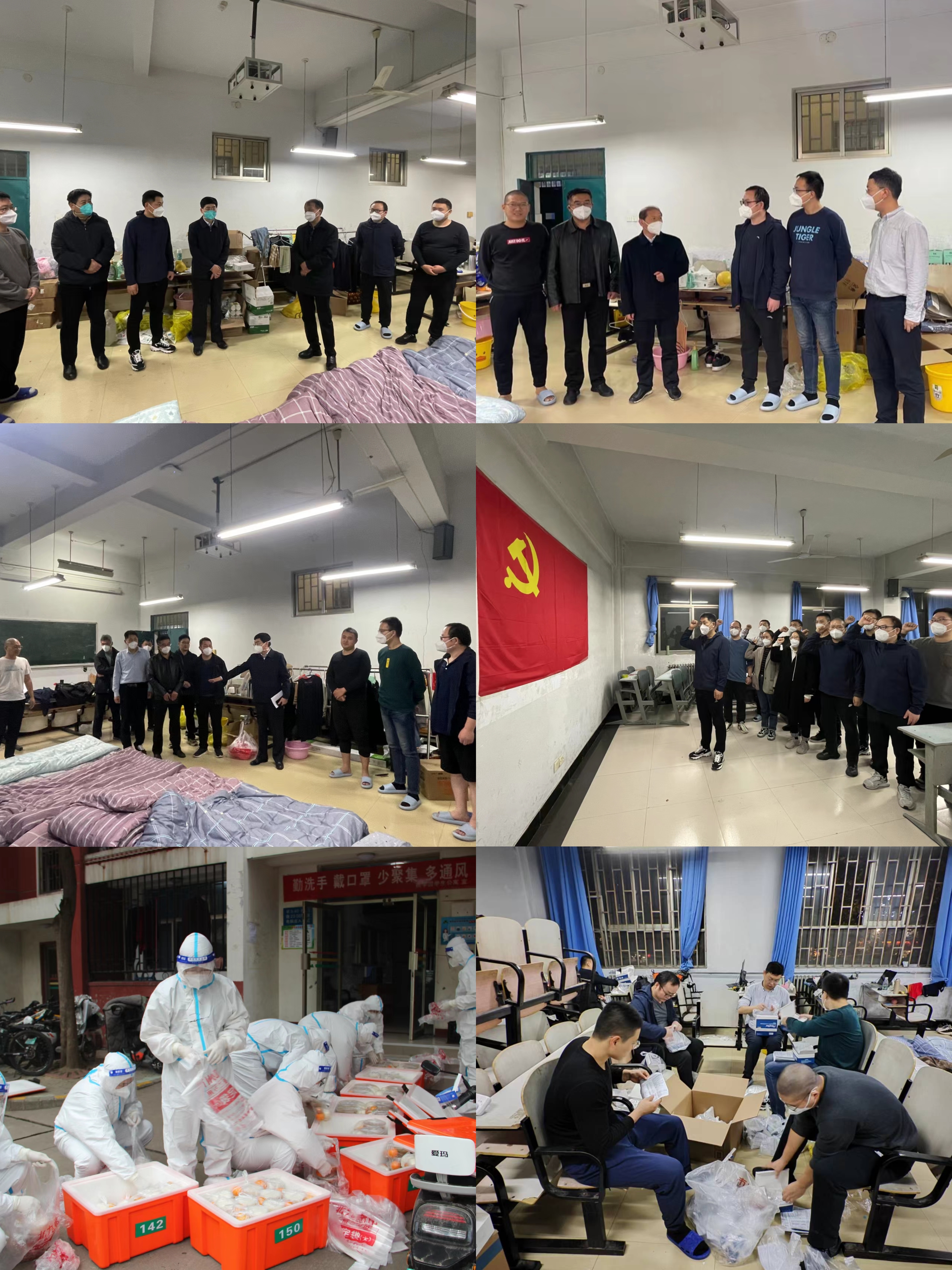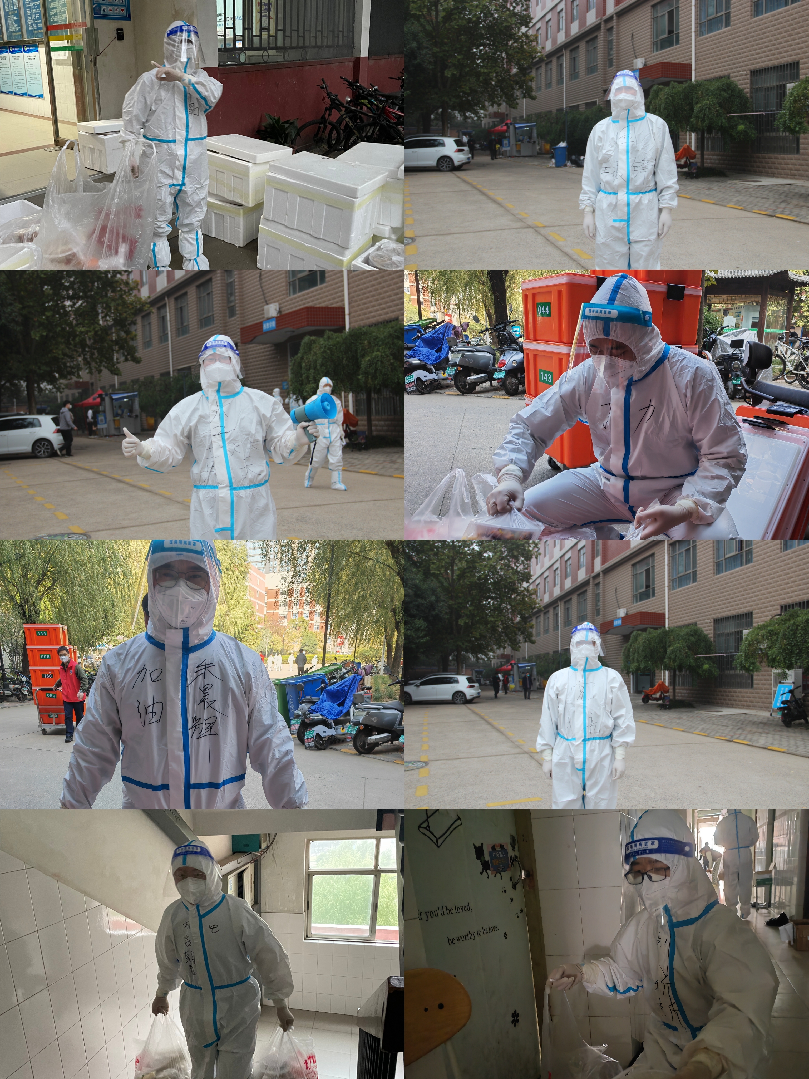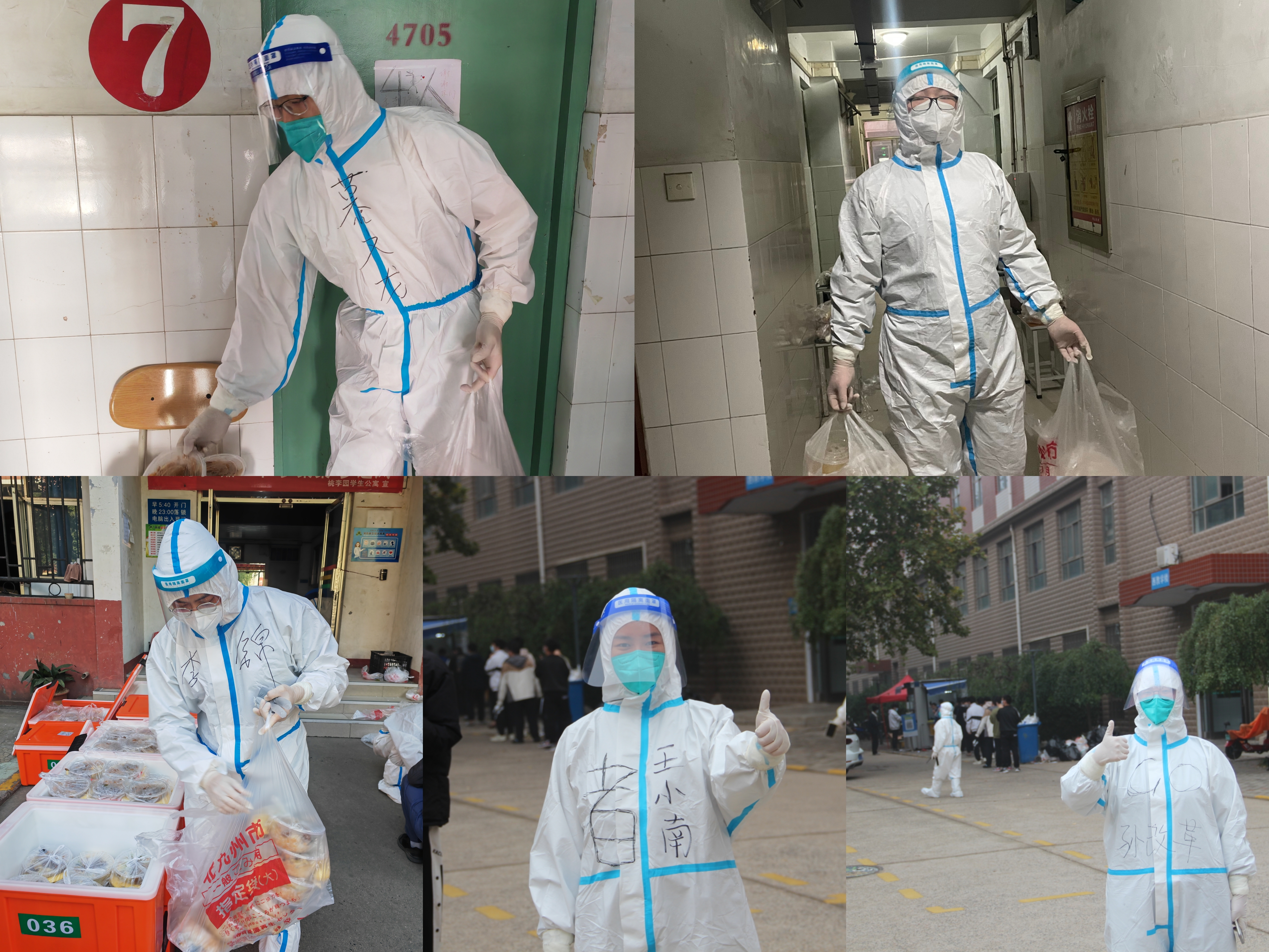 目前教工党员志愿者已经在桃李园防控一线战斗了整整13天,在桃李园学生公寓桃西楼205教室打地铺筑新家,穿上密不透气的防护服变身“人体负重爬楼机器”,从教书育人的“园丁”变成校园“疫”线的“大白”。每天三次爬楼梯把614份餐送到学生寝室门口,组织核酸检测、排查流调、数据统计、分发抗原药品和生活物资等。