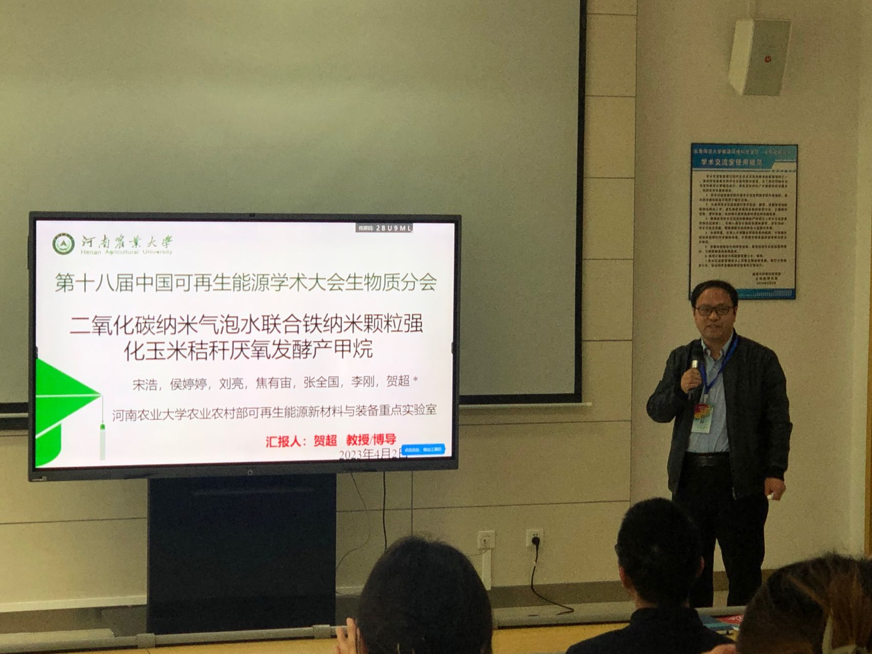 大会为期三天,主要议程包括第十八届中国可再生能源学术大会开幕式、主论坛,分会报告,生物质能专业委员会全体委员会议,生物质能分会大会报告,大会闭幕式等。贺超副教授作了题目为《二氧化碳纳米气泡联合铁纳米颗粒强化玉米秸秆厌氧发酵产甲烷》的学术报告,系统介绍了二氧化碳纳米气泡联合铁纳米颗粒对玉米秸秆厌氧发酵产甲烷的强化理论与技术。路朝阳博士作了题目为《光合生物制氢工艺强化研究》的学术报告,详细介绍了缓冲盐技术、发酵方式对光合生物制氢的强化理论与技术。