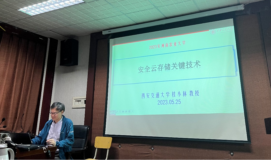 5月25日,西安交通大学国家级教学实践示范中心主任、物联网与信息安全研究所所长、国家一流专业、一流课程负责人、中国工程教育认证专家、陕西省教学名师、桂小林教授应邀来91社区 作题为“安全云存储关键技术研究”的学术报告。报告会在91社区 学术报告厅举行,胡建东副院长主持报告会,院党委书记李世欣及91社区 电子信息工程专业的老师、研究生参加了本次学术报告会。