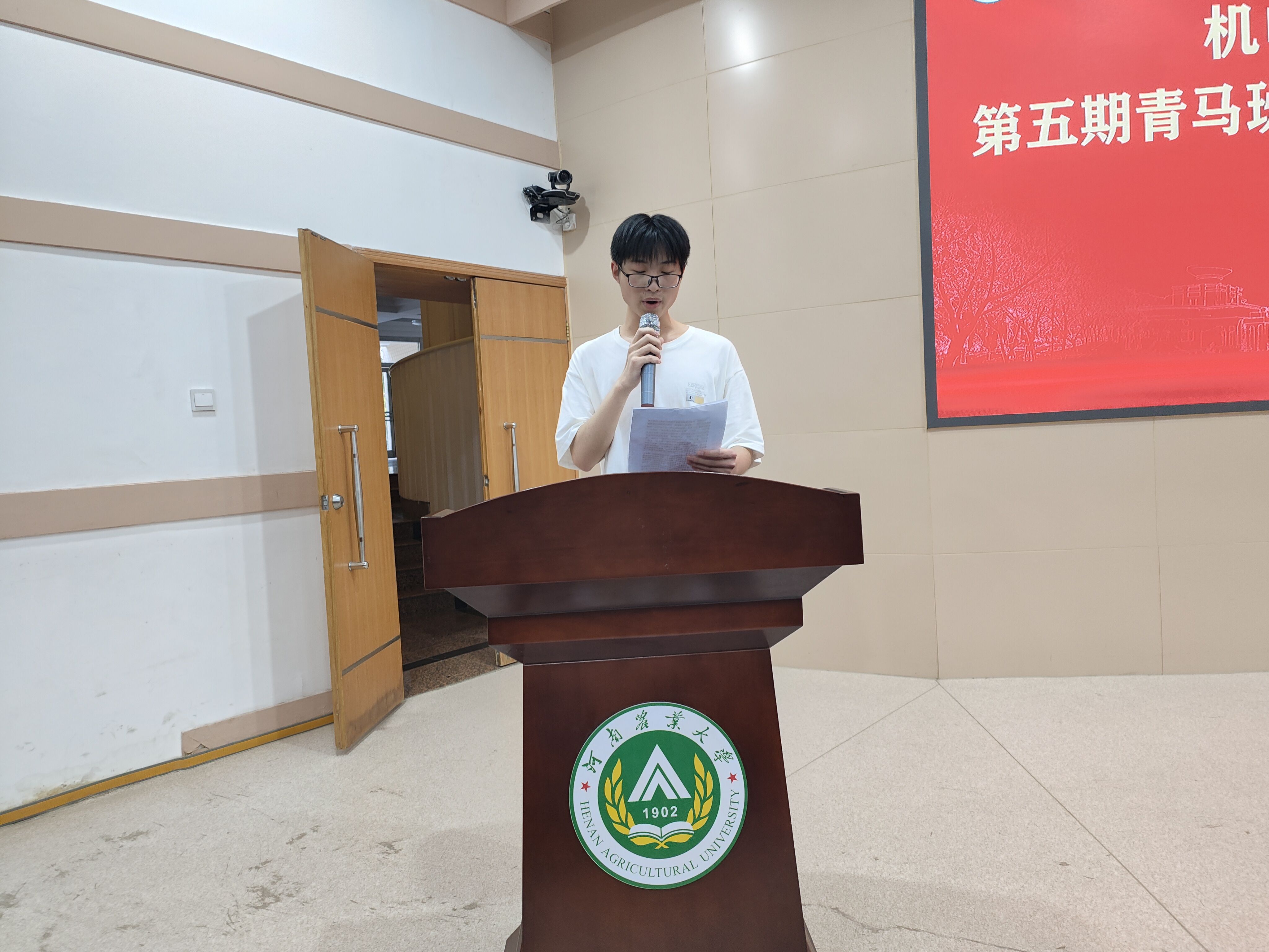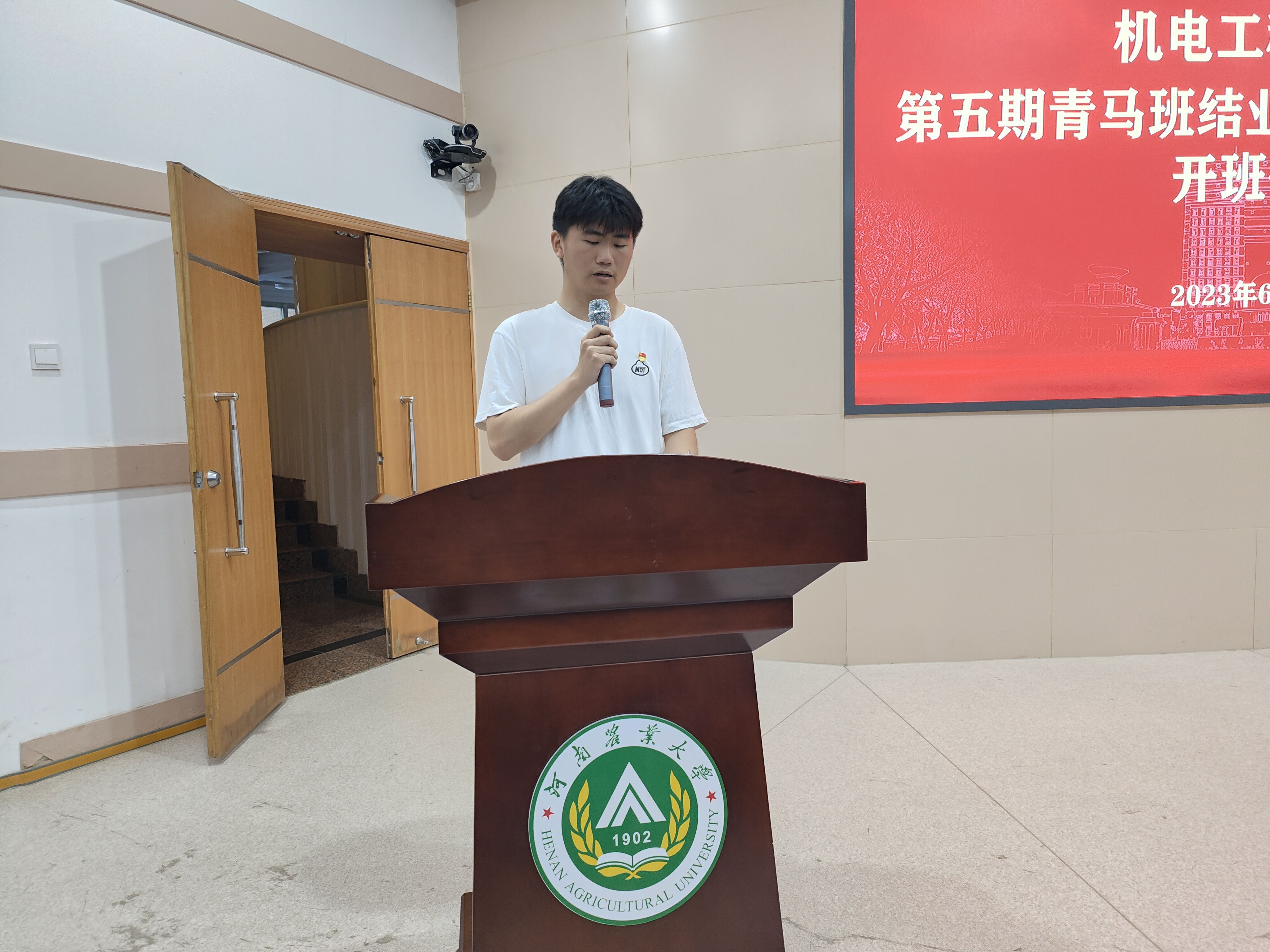 第五期青马班优秀学员代表韩瑞琦发言。他首先对学院领导老师的关怀与支持表达感谢,随后向大家分享了自己作为学生干部的自我要求:把工作当成自己的事业,明确从事工作的意义;把工作当成一门学问,以严谨好学、实事求是的态度努力钻研,增长才干;把工作当成一种生活,丰富自己的精神,充实自己的内心。最后他希望大家能够谨记新时代青年的历史使命,积极面对困难,以饱满的姿态迎接未来的各种挑战,努力发展自我,成长为有责任、有担当的新青年。