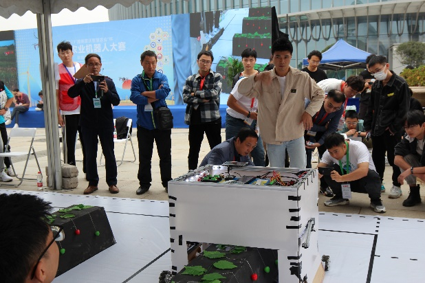 “HAU2”队(队员:李亚辉、董传鑫、李哲和梅超)设计的草莓采摘机器人采用垄上双边采摘策略,底层驱动部分使用高性能微控制器,以驱动机器人进行田间行走;果实识别部分采用自主研发的图像处理算法;果实采摘部分采用自主设计的多功能机械臂,末端搭载高精度的采摘执行机构;收集部分使用仿真软件设计出最优结构的草莓收集仓,以完成对草莓的临时仓储任务,荣获唯一的特等奖。“HAU1”队(队员:盛哲、许雪强、魏涛、徐欢和王有位)设计的草莓采摘机器人采用垄上双边采摘策略,搭载先进的图像识别系统,实现了自主巡线、垄对齐和垄上导航等一系列完整高效的自主视觉导航任务;同时,机器人采用基于视觉的机械臂伺服测控技术和基于机器学习的草莓自动识别技术,实现了对草莓的精准定位和高效采摘,荣获一等奖。“莓你不行”队(队员:王克震、申家宁、刘笑阳、李冠颉和李若石)设计的草莓采摘机器人采用独立设计的机械结构,采摘过程运用机械运动与智慧视觉相结合,对草莓进行精准采摘并放入侧边筐,实现了检测-采摘-收集一体化作业,荣获二等奖。