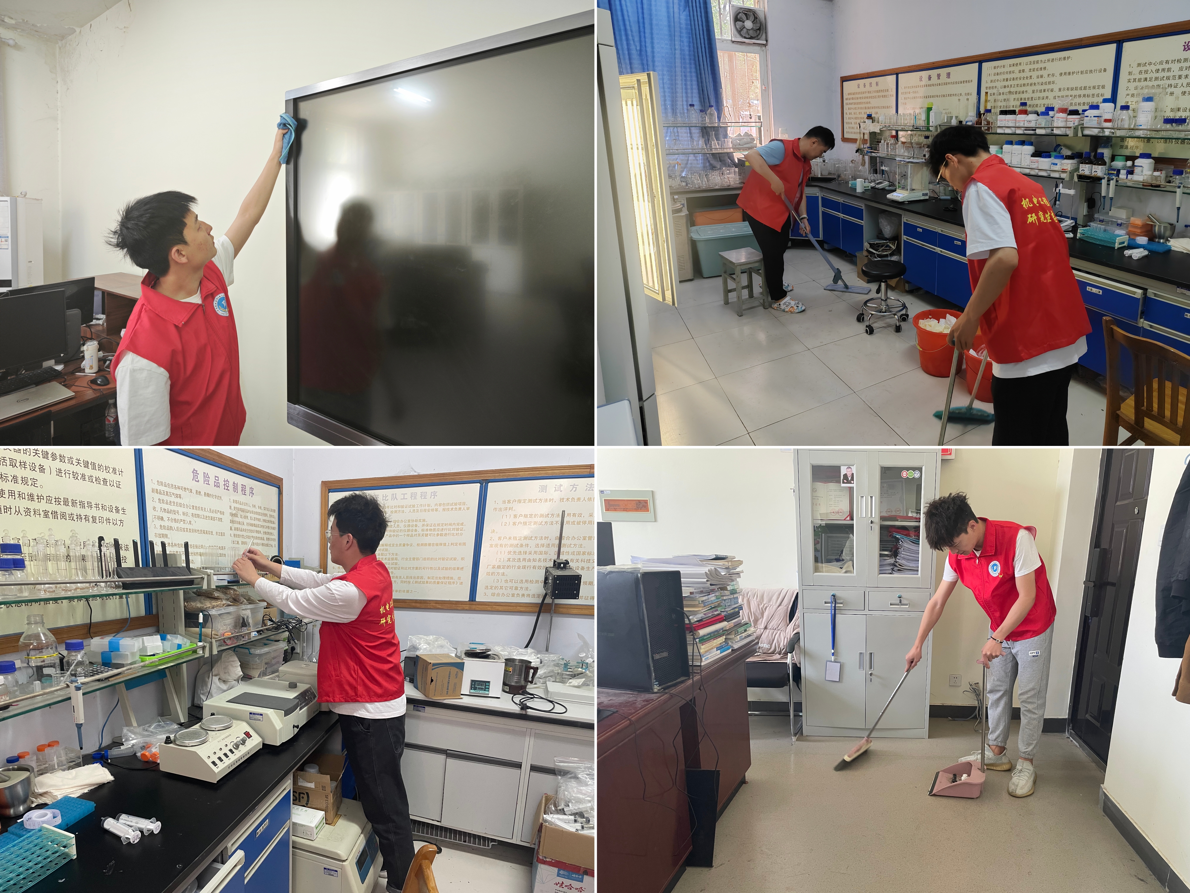 党员志愿者进行任务分配后,有序地分组合作,迅速展开了工作。他们认真清扫地面、擦拭仪器、排查安全隐患,确保不放过每一台设备、不遗漏每一个角落。志愿者们各司其职,整个过程认真细致,展现了高度负责的工作态度和乐于奉献的志愿精神。志愿活动结束后,他们整理好清洁工具,清点物品,确保一切都归位有序。经过他们的付出和努力,实验室变得焕然一新。