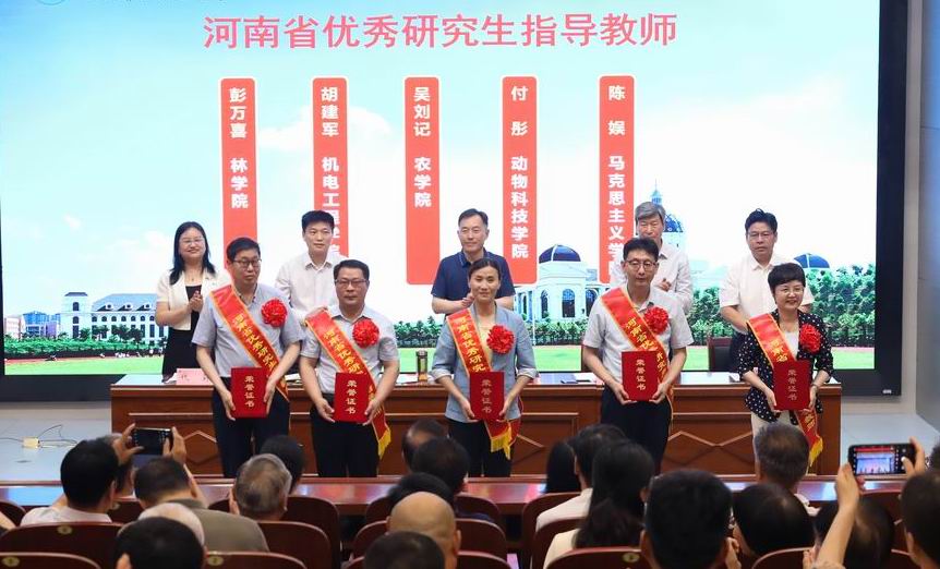 “研究生教风学风建设年”活动的通知》、《研究生导师指导行为准则》、《新时代高校教师职业行为十项准则》等重要通知文件,细化指出了研究生师生应注意和遵守的准则,为今后师生努力前进的道路指明了方向。随后,与会校领导为荣获河南省优秀研究生指导教师,91社区