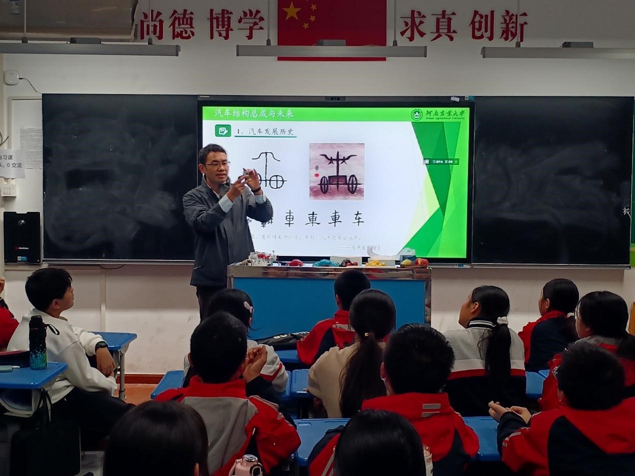 课堂开始,王老师以南宋词人辛弃疾的《青玉案·元夕》和唐代诗人白居易的《卖炭翁》引出车的基本功用。在课堂中,从黄帝的姓氏“轩辕”讲起车辆结构,到诸葛亮制作的“木牛流马”,再到国外的风帆车、蒸汽机汽车等,一直到内燃机汽车的诞生。接下来,又给同学们介绍近代时期和建国后汽车的发展,如:一汽制造的解放牌CA10型、红旗CA770型汽车以及比亚迪F3DM、特斯拉电动汽车等。然后,比较详细地给同学们介绍了传统汽车、新能源汽车的基本结构总成。最后,介绍了汽车未来的发展方向,包括动力的多样化、车身的拟人化、控制的智能化以及驾驶的无人化等。课堂尾声,王老师以《西游记》中石猴出世中的人物“顺风耳”、“千里眼”联系到现在的语音、远程视频等科技,鼓励同学们敢想敢为,努力实现心中的梦想。