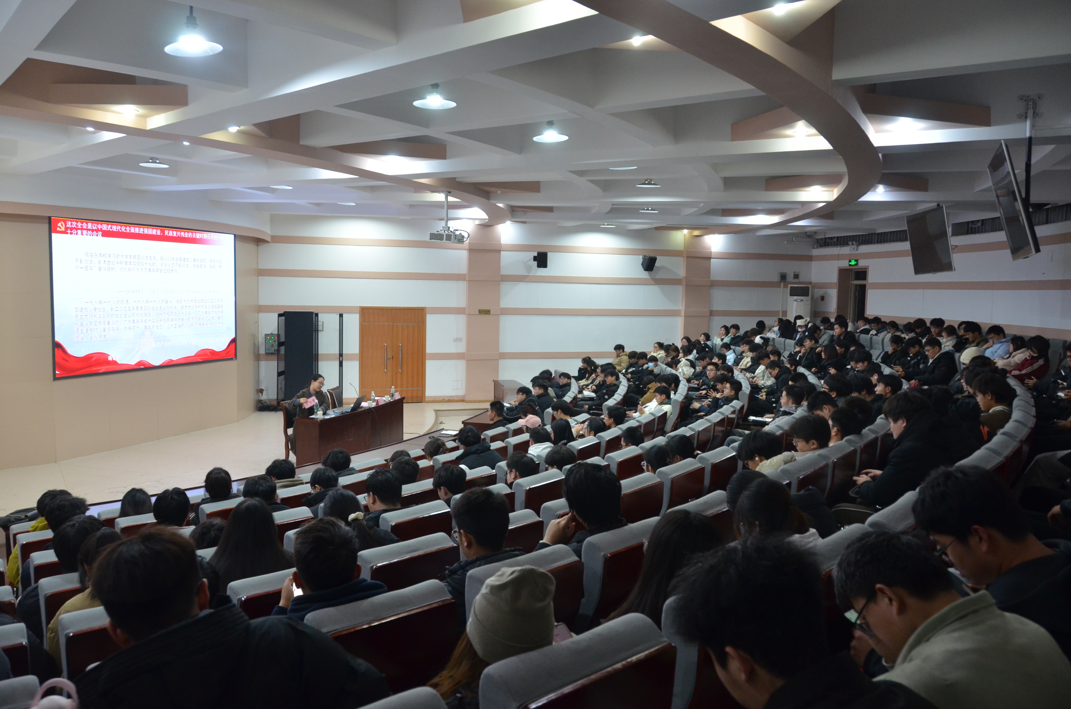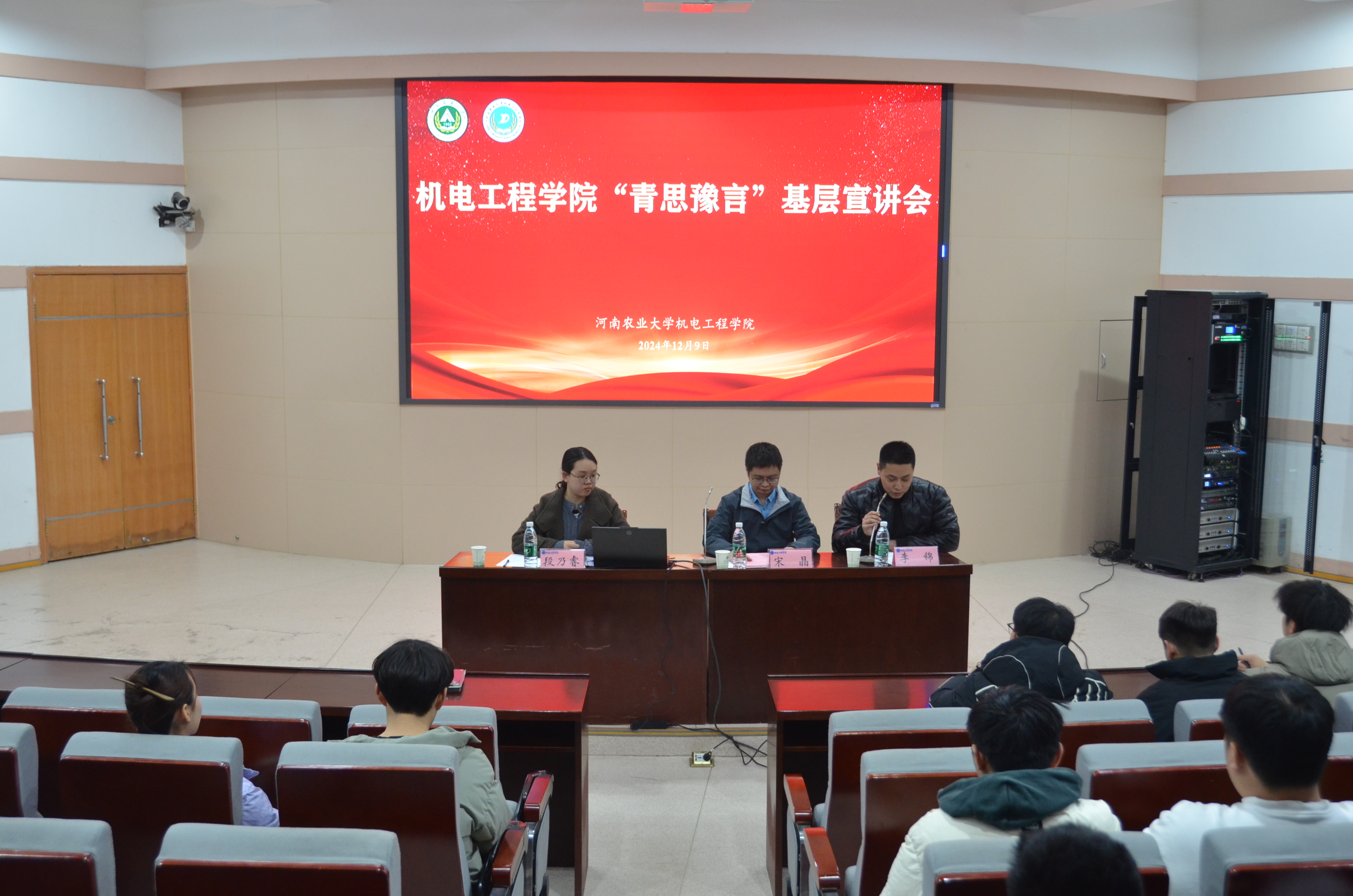 于12月9日邀请河南省团校优秀教师、河南省青少年研究会会员、河南省“青飞YOUNG”宣讲队宣讲员段乃睿老师在文化路校区300人报告厅开展“青思豫言”基层宣讲会,学院党委副书记宋晶、研究生辅导员李锦及团委学生组织骨干、青马班学员、24级全体研究生共200余人参加宣讲活动。活动由李锦主持。