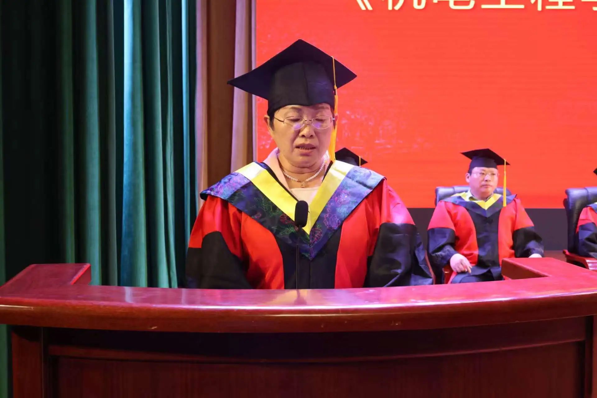教师代表袁志华教授进行发言,她向2025届毕业生致以祝贺,感慨于他们完成学业即将奔赴新岗位。同时,对毕业生提出两点期望:一是心存敬畏真理、责任与生命,守护精神底线;二是铭记身份转变,以所学回报社会,在新征程中勇担使命。