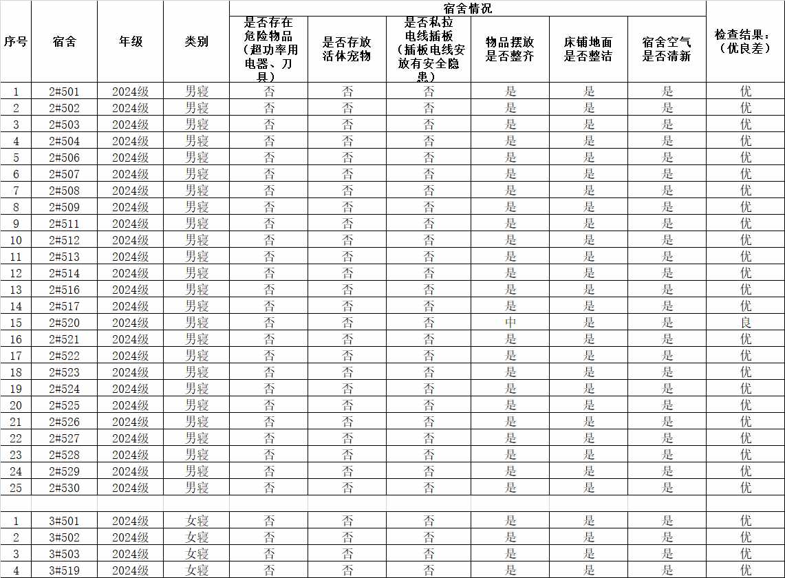 为进一步加强校园文明建设,培养同学们良好的学习、生活习惯,促进学生养成良好的劳动习惯,同时营造温馨、舒适、健康、和谐的寝室文化氛围,学院研究生会生活部对24级宿舍进行安全卫生检查,检查情况公示如下: