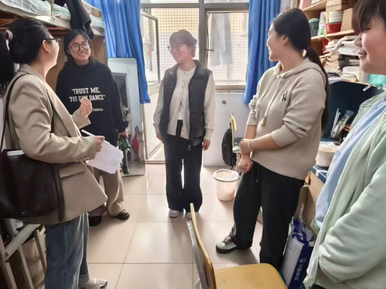 检查过程中,老师们逐一查看各宿舍的卫生状况,细致排查宿舍安全隐患,对物品摆放、地面清洁、床铺整理等方面进行全面检查,同时耐心指出存在的问题,给出针对性的整改建议。