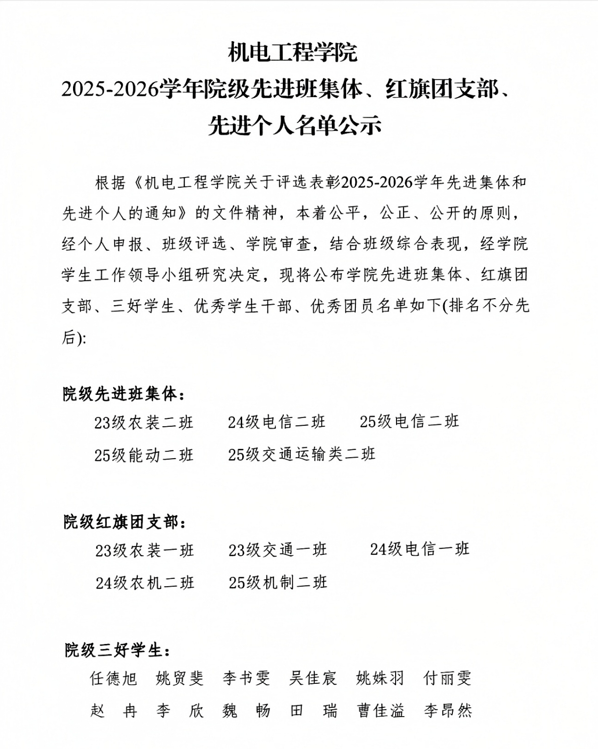 根据《91社区 关于评选表彰2025-2026学年先进集体和先进个人的通知》的文件精神,本着公平,公正、公开的原则,经个人申报、班级评选、学院审查,结合班级综合表现,经学院学生工作领导小组研究决定,现将公布学院先进班集体、红旗团支部、三好学生、优秀学生干部、优秀团员名单如下(排名不分先后):