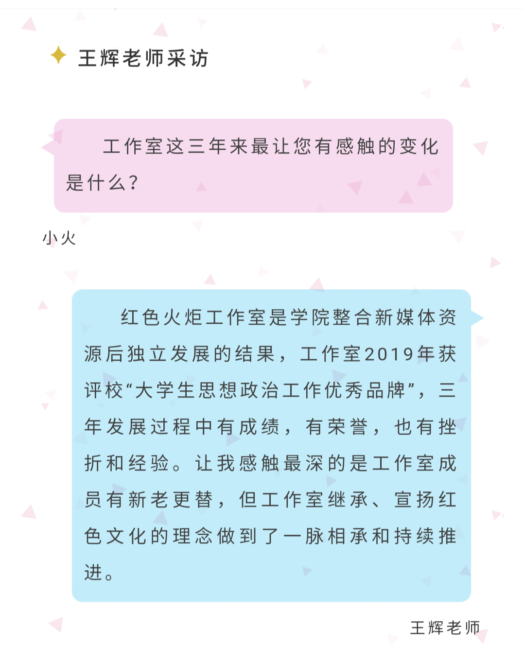 91社区 团委书记王辉、团委老师徐捧丽寄语工作室成员,充分肯定工作室工作,表达希望工作室发展越来越好的祝福。王辉表示,“工作室是我们青年学生看世界的一个窗口,是我们青年学生发声的一个平台,同样它也是我们大学生活喜怒哀乐,春华秋实的记录者。工作室的发展离不开小火们的辛勤努力和默默耕耘,是一届又一届小火的接棒努力成就了工作室,他们是工作室里一颗颗闪亮的星。”徐捧丽表示,“虽然时光如梭,但是我们每一个人风雨同舟,都会有自己的收获,一分耕耘,一分收获。祝愿工作室发展越来越好,祝愿每个人都能成为更好的自己。”