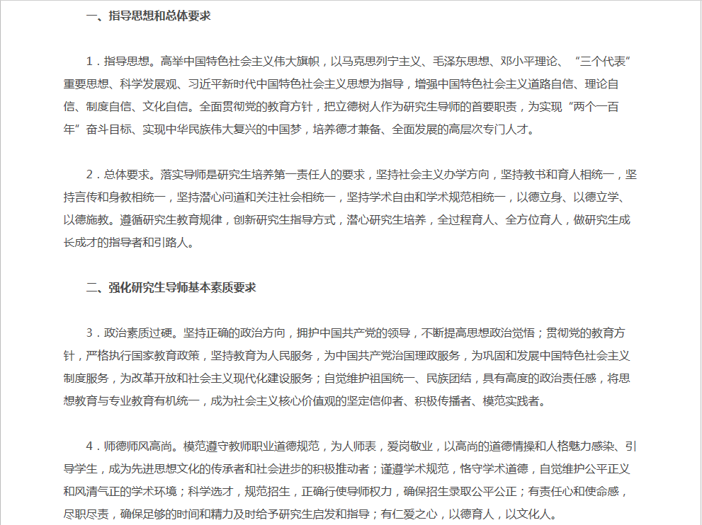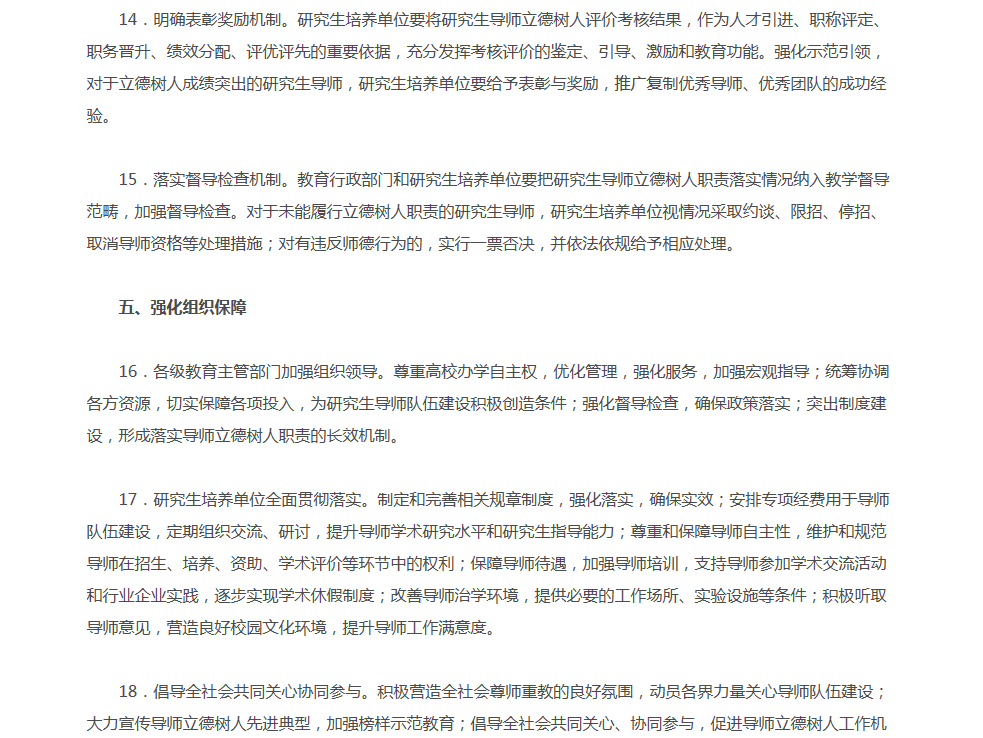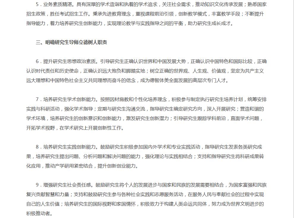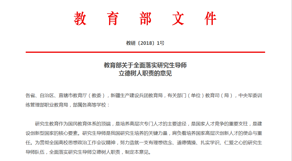 为贯彻全国高校思想政治工作会议精神,努力造就一支有理想信念、道德情操、扎实学识、仁爱之心的研究生导师队伍,全面落实研究生导师立德树人职责,教育部制定了《教育部关于全面落实研究生导师立德树人职责的意见》(教研〔2018〕1号)。请各学科研究生指导教师认真学习文件,并在研究生培养过程中贯彻落实文件精神。