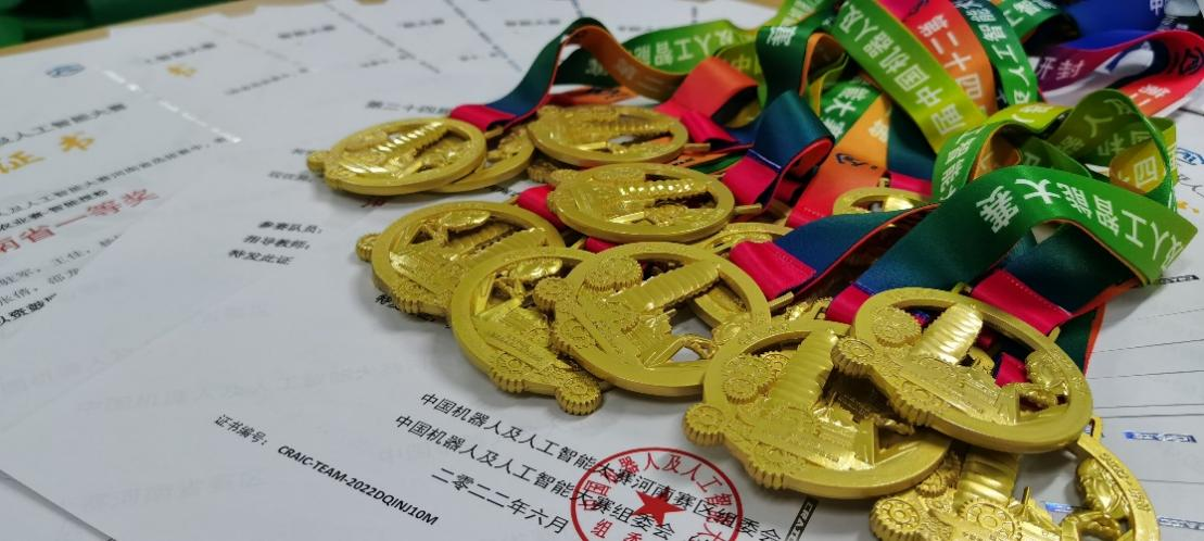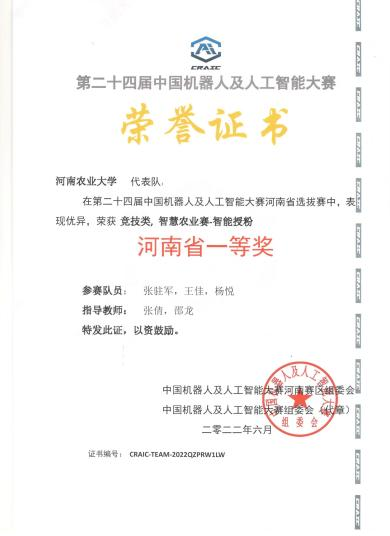由肖亚涛、王栋老师指导,刘恩光、黄泽全、关争气同学组建的“求是队”凭借智能喷药机器人作品取得大赛(竞技类,智慧农业赛-智能喷药)一等奖;由黄会男、陈永老师指导,王佳、张轲、赵唯同学组建的“力行队”凭借智能喷药机器人作品取得大赛(竞技类,智慧农业赛-智能喷药)一等奖;由张倩、邵龙老师指导,张驻军、王佳、杨悦同学组建的“自强队”凭借智能授粉机器人作品取得大赛(竞技类,智慧农业赛-智能授粉)一等奖;由丁攀、商俊娟老师指导,张轲、刘恩光、李云飞同学组建的“大黄蜂队”凭借智能授粉机器人作品取得大赛(竞技类,智慧农业赛-智能授粉)二等奖;由赵宁、李鹏飞老师指导,黄泽全、陈建行、刘涛同学组建的“明德队”凭借智能授粉机器人作品取得大赛(竞技类,智慧农业赛-智能授粉)二等奖;由刘晓潺、周培林老师指导,陈建行、张驻军、王帅智同学组建的“XYG队”凭借智能喷药机器人作品取得大赛(竞技类,智慧农业赛-智能喷药)二等奖。