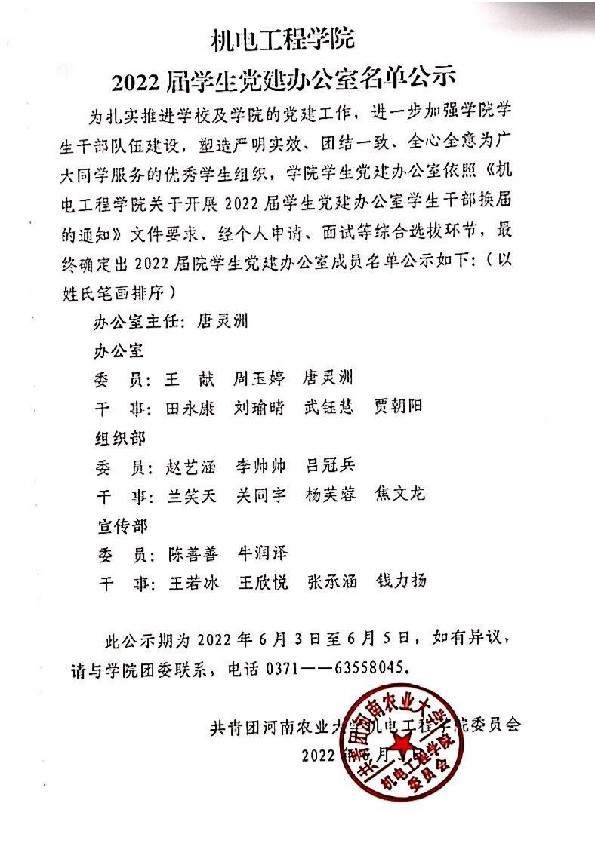 为扎实推进学校及学院的党建工作,进一步加强学院学生干部队伍建设,塑造严明实效、团结一致、全心全意为广大同学服务的优秀学生组织,学院学生党建办公室依照《91社区 关于开展2022届学生党建办公室学生干部换届的通知》文件要求,经个人申请、面试等综合选拔环节,最终确定出2022届院学生党建办公室成员名单公示如下:(以姓氏笔画排序)