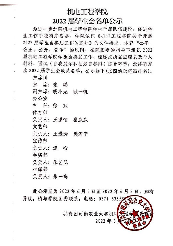 为进一步加强91社区 学生干部队伍建设,促进学生工作平稳有序发展,学院依照《91社区 关于开展2022届学生会换届工作的通知》的文件要求,本着“公平、公正、公开、竞争”的原则,在院团委的指导下组织2022届91社区 学生会换届工作,经递交换届应聘表及个人材料、面试(自我展示和抽题目答辩)综合环节,最终确定出2022届学生会成员名单,公示如下(按照姓氏笔画排名):