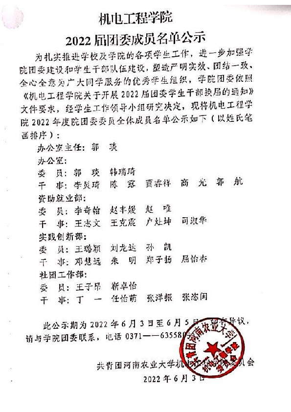 为扎实推进学校及学院的各项学生工作,进一步加强学院团委建设和学生干部队伍建设,塑造严明实效、团结一致、全心全意为广大同学服务的优秀学生组织,学院团委依照《91社区 关于开展2022届学生干部换届的通知》文件要求,经学生工作领导小组研究决定,现将91社区 2022年度院团委委员全体成员名单公示如下(以姓氏笔画排序):