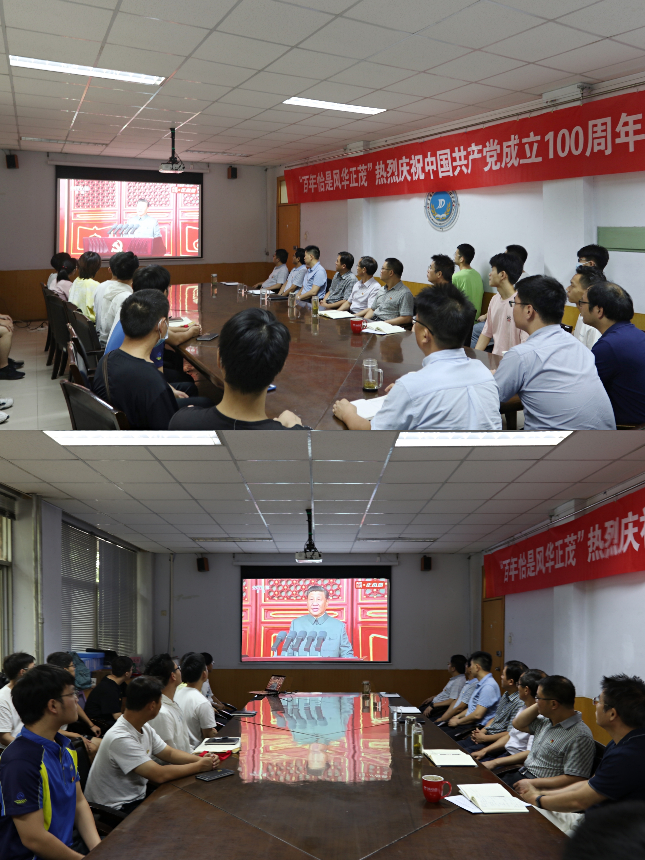 观看现场,全体师生党员均聚精会神地观看直播。天安门广场上响起的国歌、鸣响的礼炮、迎风招展的红旗,无一不激发着人们对党的热爱与祝福。全体党员端坐其位,认真聆听习近平总书记发表重要讲话。中国共产党一经诞生,就把为中国人民谋幸福、为中华民族谋复兴确立为自己的初心使命。一百年来,中国共产党的先驱们形成了坚持真理、坚守理想,践行初心、担当使命,不怕牺牲、英勇斗争,对党忠诚、不负人民的伟大建党精神,这是中国共产党的精神之源。党成立时只有50多名党员,今天已经成为拥有9500多万名党员、领导着14亿多人口大国、具有重大全球影响力的世界第一大执政党。中国共产党立志于中华民族千秋伟业,百年恰是风华正茂。回首过去,展望未来,有中国共产党的坚强领导,有全国各族人民的紧密团结,全面建成社会主义现代化强国的目标一定能够实现,中华民族伟大复兴的中国梦一定能够实现。