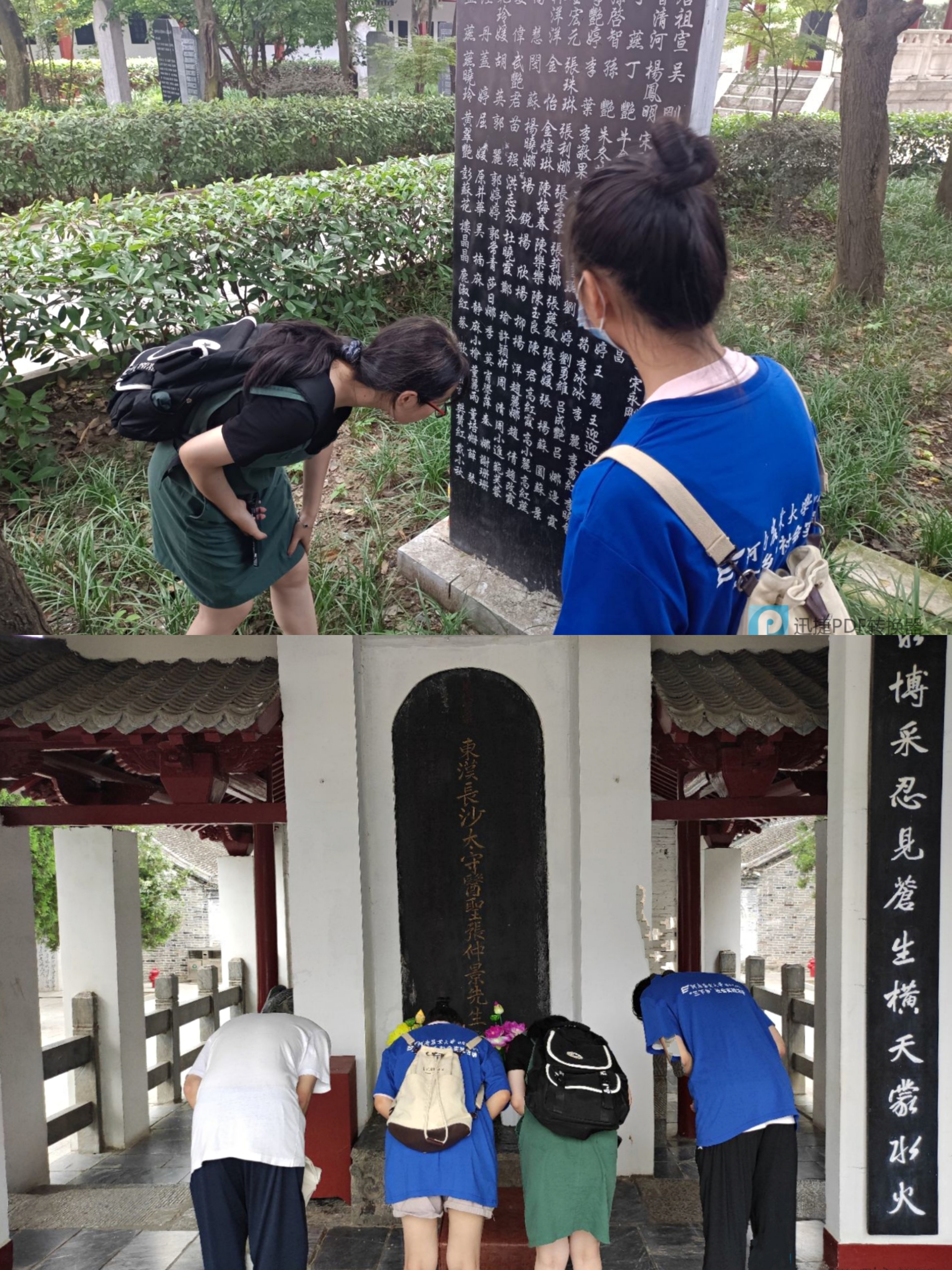 7月4日,实践队员们参观了医圣祠的后祠,张仲景的陵墓便建于此。墓顶的莲花座,象征着张仲景“出淤泥而不染”的高尚医德医风,花墙环绕,凉亭盖顶,庄严肃穆,使人顿发敬仰之情。在陵墓石碑前,实践队员们深情鞠躬,表达了心中对医圣的爱戴与敬仰。