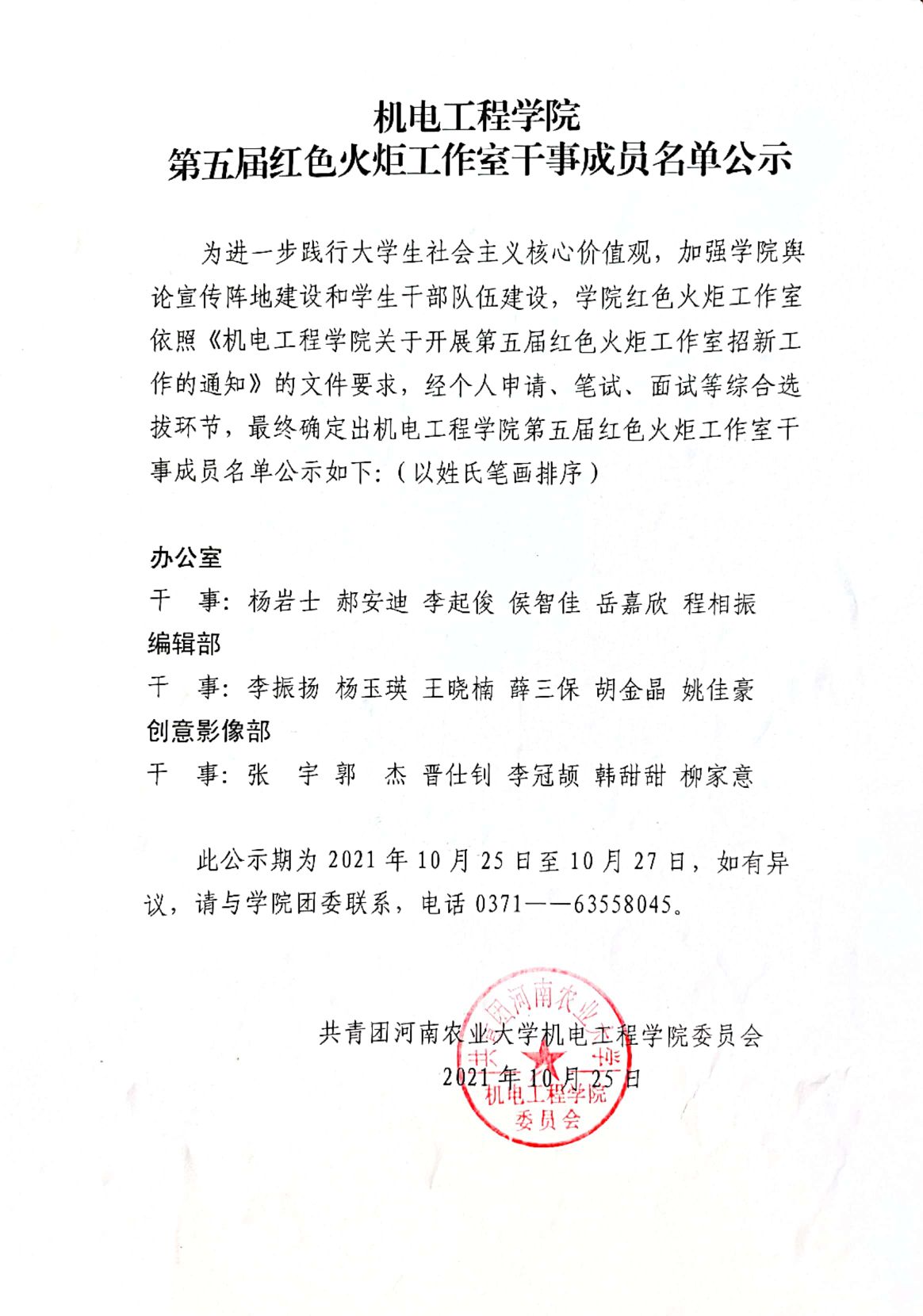 为进一步践行大学生社会主义核心价值观,加强学院舆论宣传阵地建设和学生干部队伍建设,学院红色火炬工作室依照《91社区 关于开展第五届红色火炬工作室招新工作的通知》的文件要求,经个人申请、笔试、面试等综合选拔环节,最终确定出91社区 第五届红色火炬工作室干事成员名单公示如下:(以姓氏笔画排序)