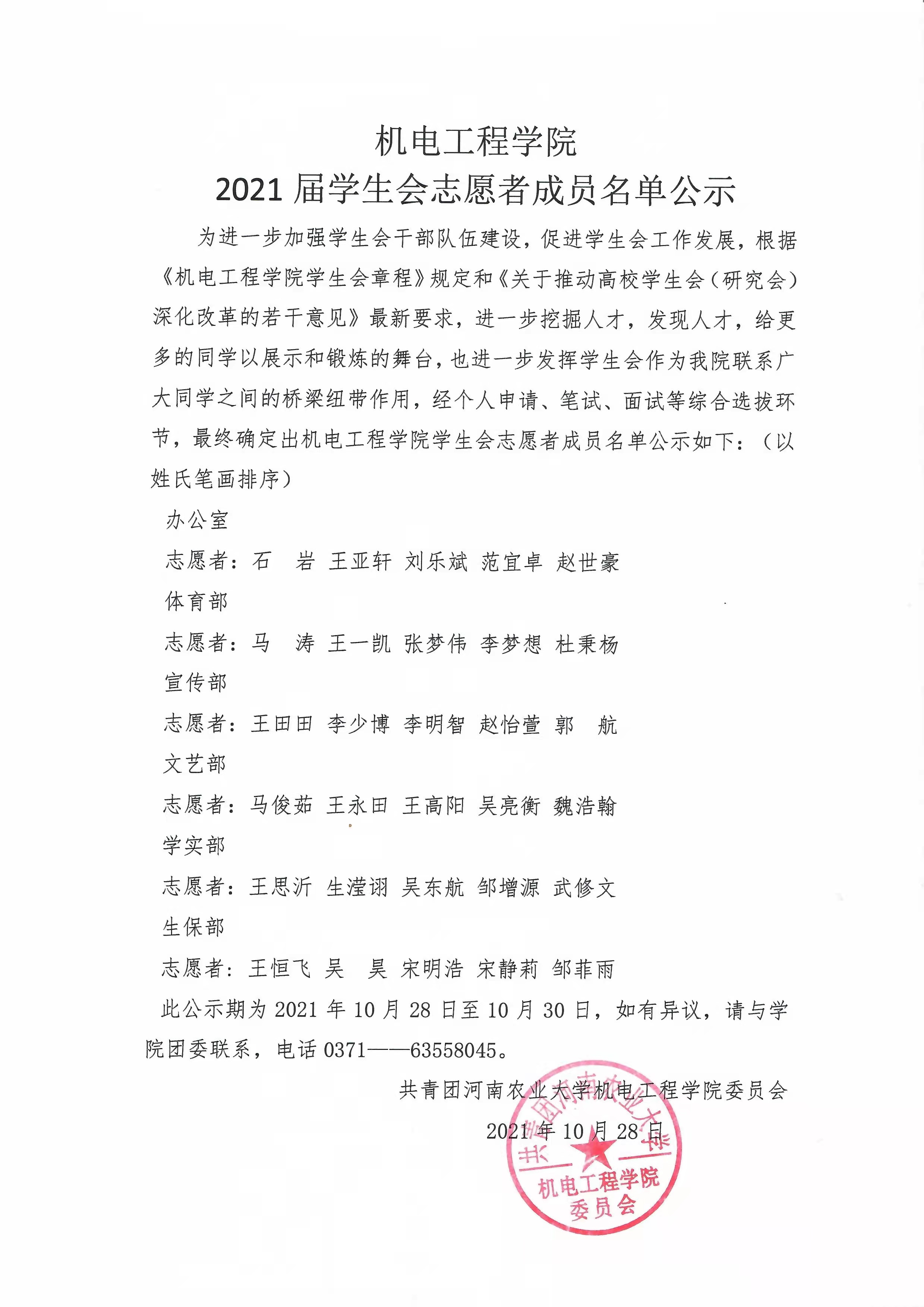 为进一步加强学生会干部队伍建设,促进学生会工作发展,根据《91社区 学生会章程》规定和《关于推动高校学生会(研究会)深化改革的若干意见》最新要求,进一步挖掘人才,发现人才,给更多的同学以展示和锻炼的舞台,也进一步发挥学生会作为91社区 联系广大同学之间的桥梁纽带作用,经个人申请、笔试、面试等综合选拔环节,最终确定出91社区 学生会志愿者成员名单公示如下:(以姓氏笔画排序)