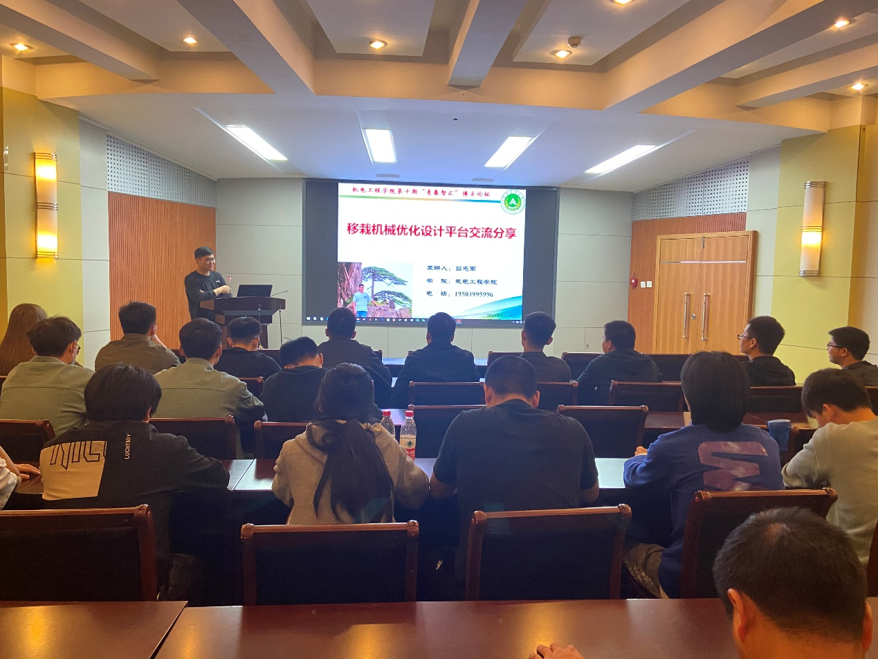 吕志军博士以“移栽机械优化设计平台交流分享”为主题,“从个人简介”、“研究生学习生活分享”、 “科研平台交流分享”、 “科研比赛及成果留影”以及“课题组研究进展”等五个方面深入阐述了如何进行科研工作。他指出,要做好科研工作和学习,就必须积极融入课题组,要主动参与课题组的任务,对自己的研究方向进行深入学习和研究。吕志军博士以自己的研究生学习生活为例,向与会研究生介绍了自己参与第二代浮船板的研发、建模以及产品加工与装配的工作。同时,吕志军博士还展示了自己的科研成果以及比赛留影,带同学们了解了世界领先的取苗式和取钵式回转式钵苗移栽机构。最后,吕志军博士告诫同学们,要珍惜研究生期间的美好时光,这些都将是人生路上最宝贵的财富;在学习的过程中,要不断交流与分享,学习他人之所长;在进行科研的道路上,要树立好自己的目标,付诸行动、扎实基础。