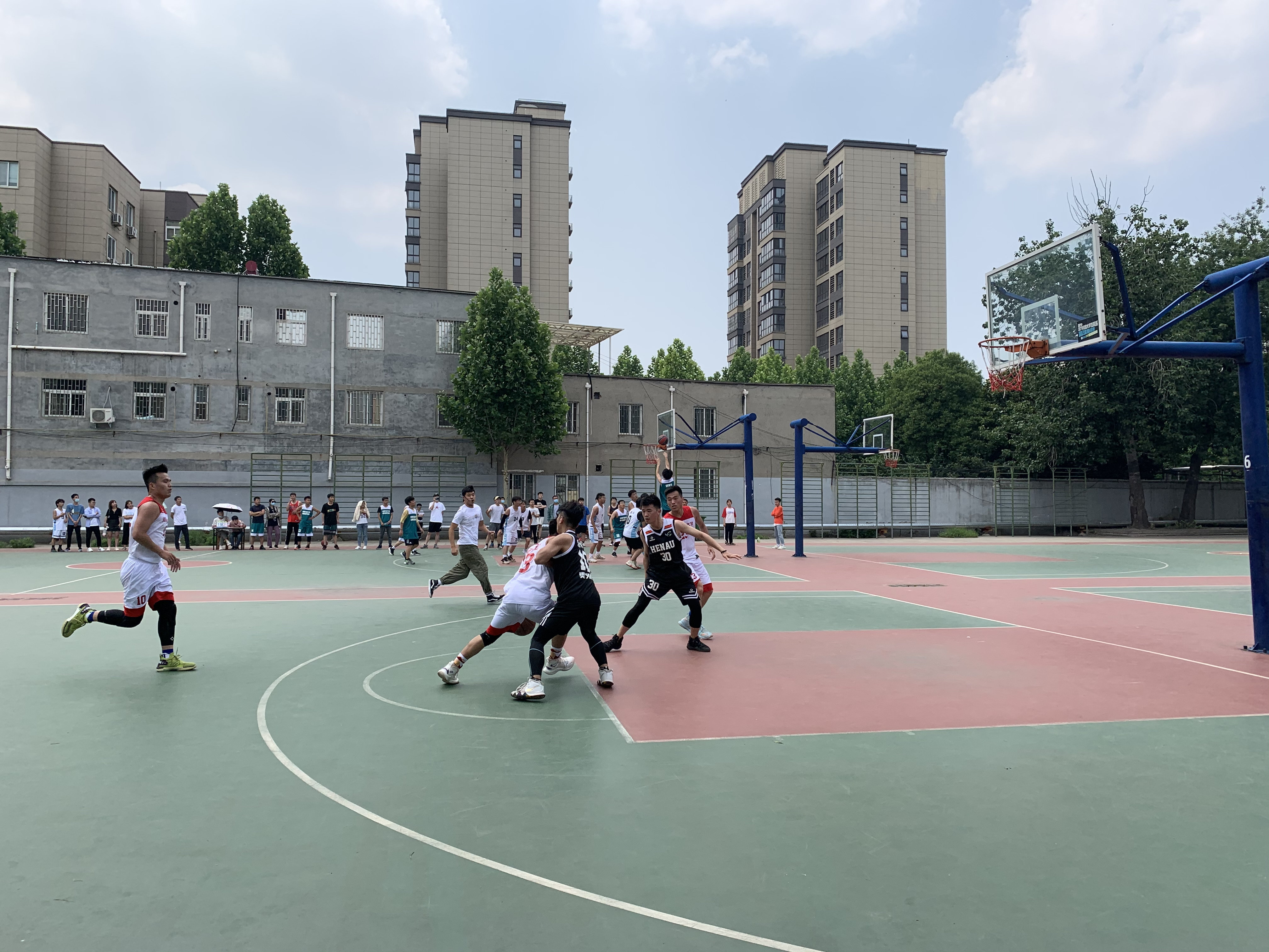 本次篮球比赛,共分为四轮。前两轮采用淘汰赛,第一轮共五组十支队伍,淘汰两组分差最大且未获胜的队伍,决出前8名;第二轮八支队伍,进行八强淘汰赛,选出四强进入第三轮;第三轮四支队伍胜利的两支进入第四轮决出冠、亚军,另外两支队伍决出三、四名。队员们顶着烈日,一个个进取拼搏、一路奋勇,展现了运动员的风采,留下了精彩瞬间。