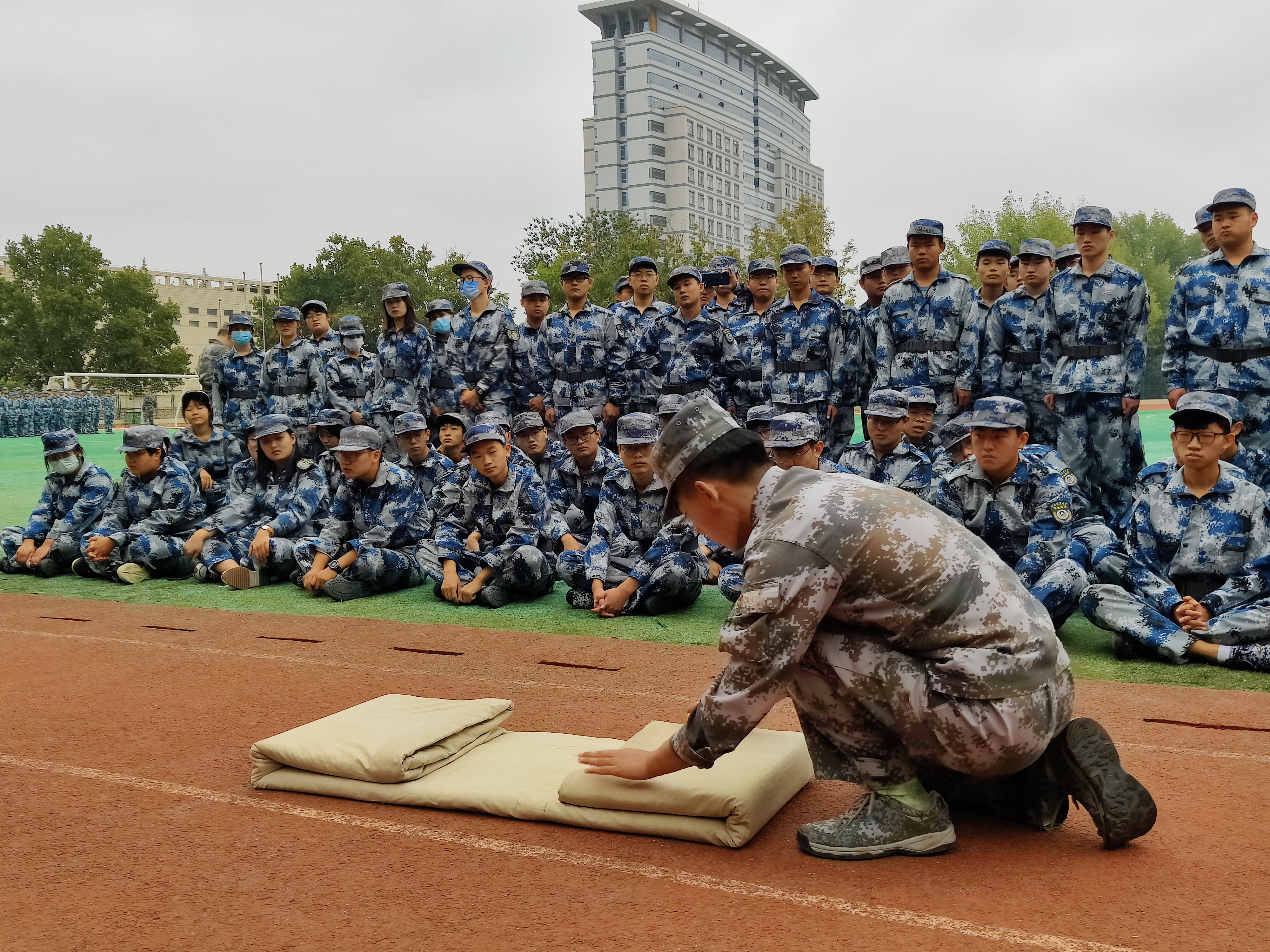 于文化路校区操场举办2022级新生国防教育素质教育活动。全体2022级新生参加活动,指导员对其进行指挥训练。