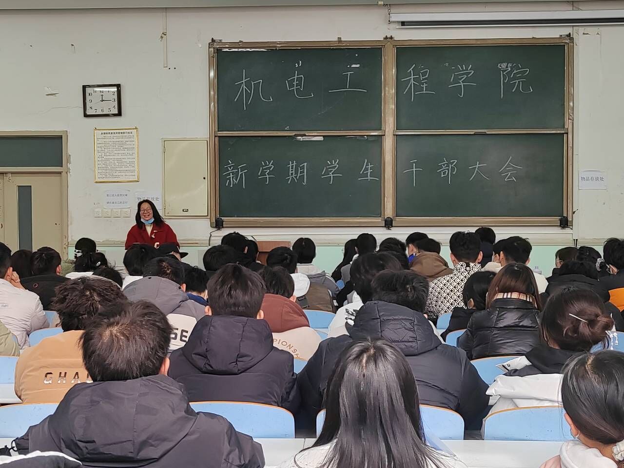 于工程楼103教室召开新学期全院学生干部会议。院团委书记黄笑,团委副书记徐捧丽,年级辅导员胡亭亭、王晓楠、孙改革出席本次会议,院学生组织主要成员、各年级班长支书参与会议。