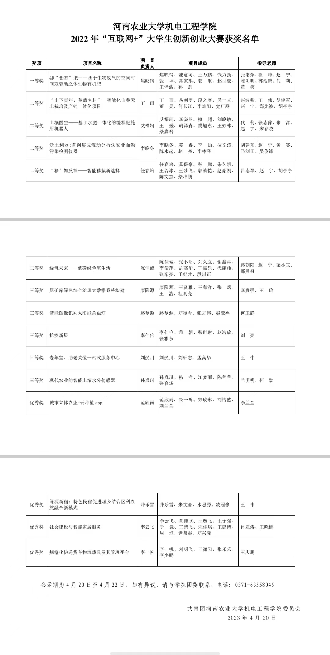 为贯彻落实河南省教育厅等部门《关于举办2022年河南省“互联网+”大学生创新创业大赛》文件精神,进一步激发学生创新创业热情,展示学院创新创业教育成果,不断提高创新创业人才培养水平,91社区 广泛动员,积极组织开展了2022年“互联网+”大学生创新创业大赛,最终评选出一等奖1名,二等奖5名,三等奖5名,优秀奖4名。现将获奖名单公示如下: