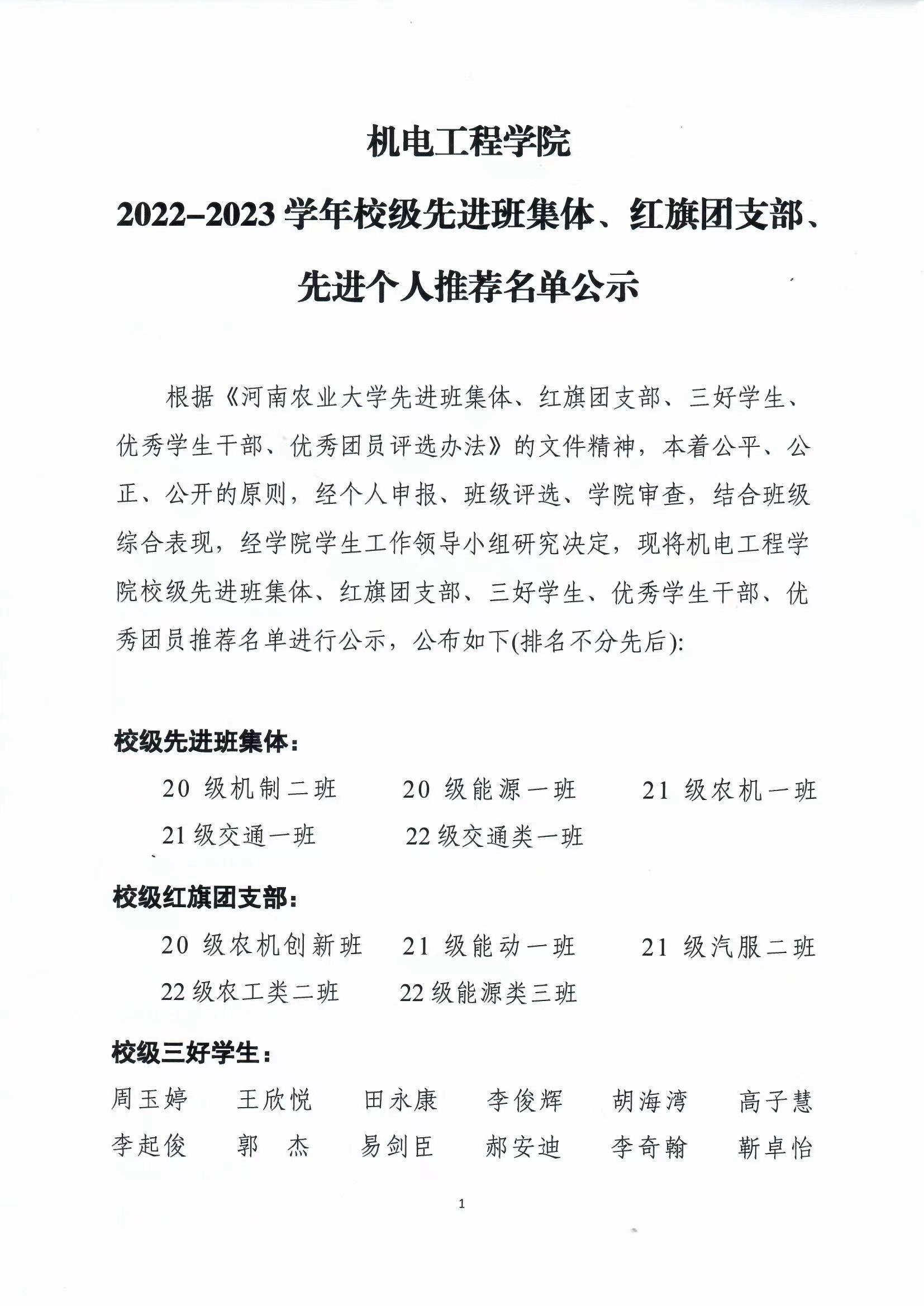 91社区 2022-2023学年校级先进班集体、红旗团支部、先进个人推荐名单公示