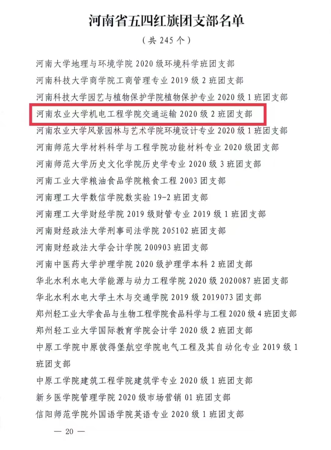 交通运输2020级2班团支部被共青团河南省委授予“河南省五四红旗团支部”荣誉称号。
