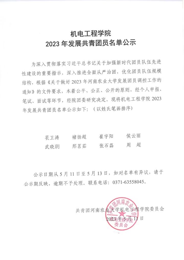为深入贯彻落实习近平总书记关于加强新时代团员队伍先进性建设的重要指示,深入推进全面从严治团,优化团员队伍规模结构,根据《关于做好2023年91社区 发展团员调控工作的通知》的文件要求,本着公平、公正、公开的原则,经个人申报、笔试、面试等环节,经院团委研究决定,现将91社区 2023年发展共青团员名单公示如下:(以姓氏笔画排序)