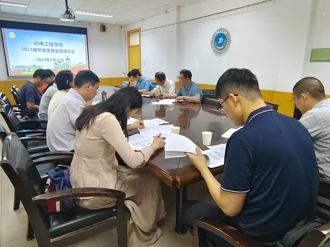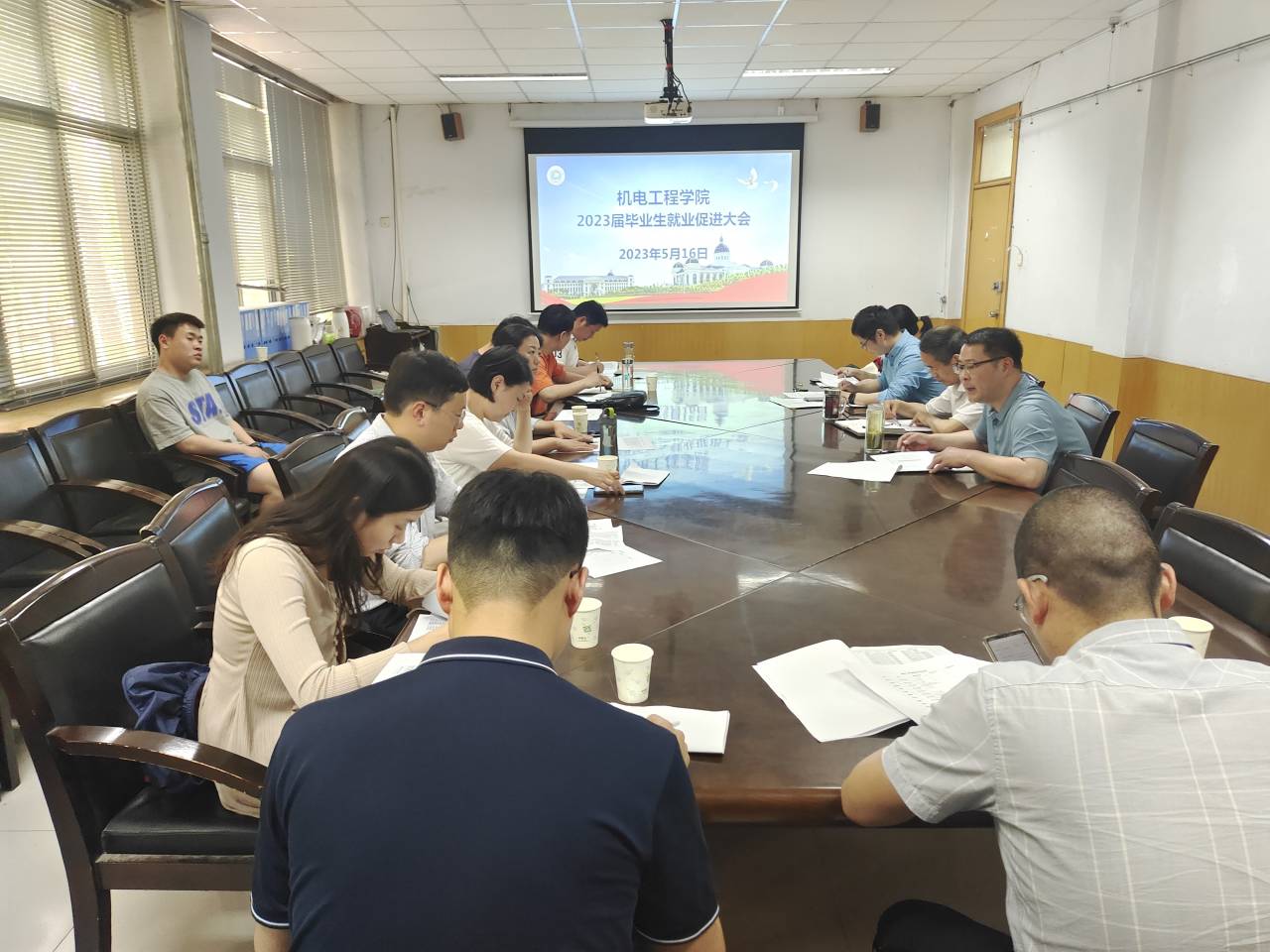 在文化路校区15号楼会议室召开2023届毕业生就业促进大会。院党委书记李世欣,院长胡建军,党委副书记宋晶,年级辅导员孙改革和各毕业班专业辅导员参加此次会议。