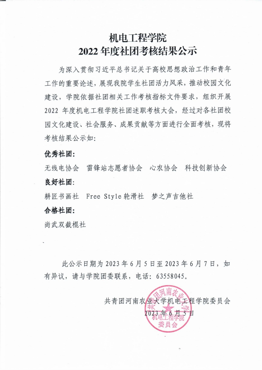 为深入贯彻习近平总书记关于高校思想政治工作和青年工作的重要论述,展现91社区 学生社团活力风采,推动校园文化建设,学院依据社团相关工作考核指标文件要求,组织开展2022年度91社区 社团述职考核大会,经过对各社团校园文化建设、社会服务、成果贡献等方面进行全面考核,现将考核结果公示如: