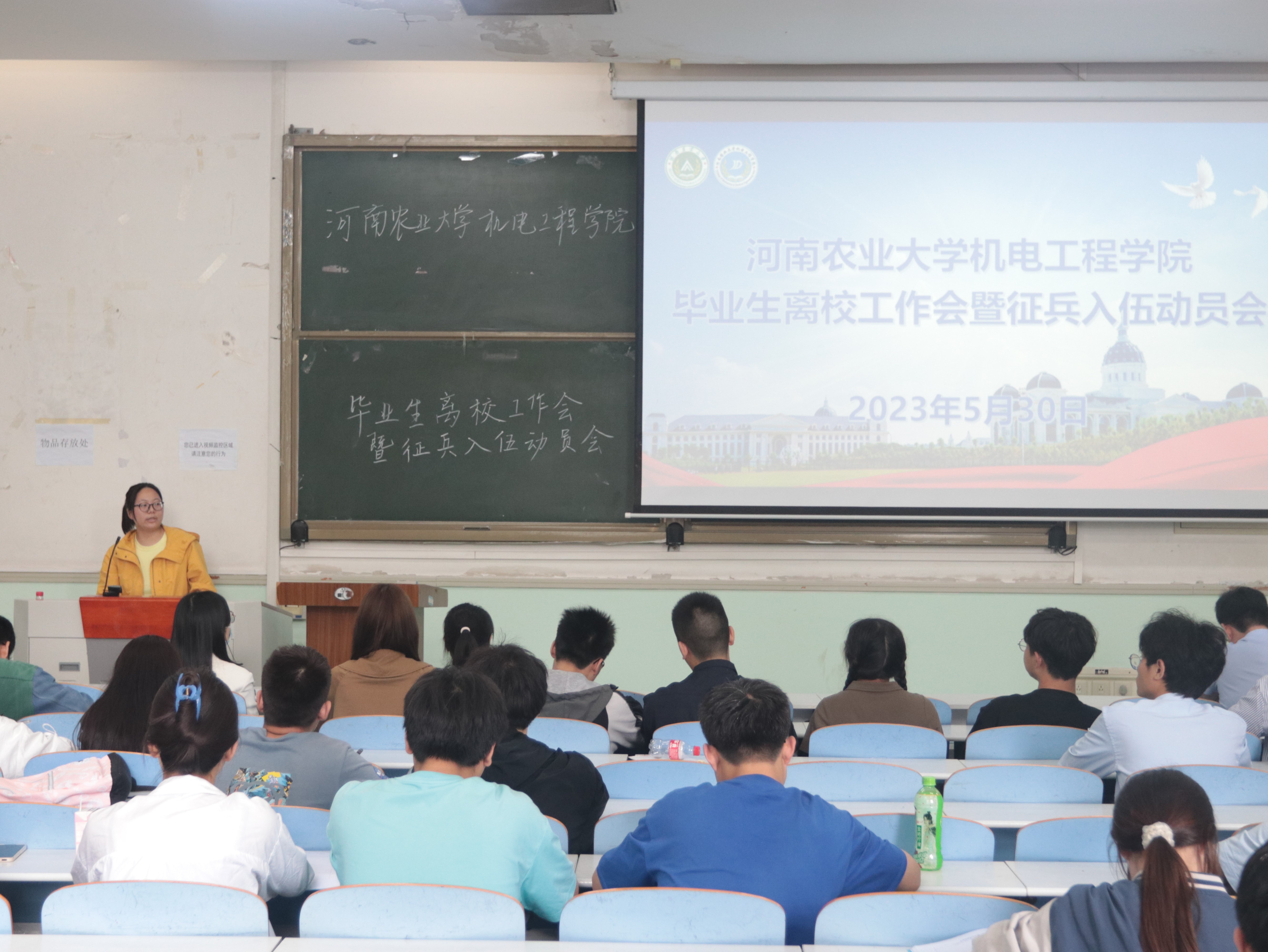 于文化路校区工程楼102教室召开毕业生离校工作会暨征兵入伍动员会,院团委书记黄笑,团委副书记王晓楠、胡亭亭,年级辅导员孙改革出席会议。全体班长支书及部分学生干部参加会议。