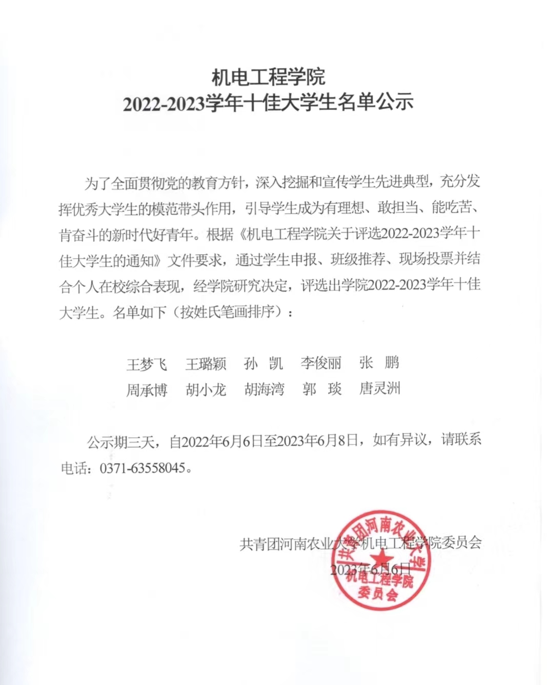 为全面贯彻党的教育方针,深入挖掘和宣传学生先进典型,充分发挥优秀大学生的模范带头作用,引导学生成为有理想、敢担当、能吃苦、肯奋斗的新时代好青年。根据《91社区 关于评选2022-2023学年十佳大学生的通知》文件要求,通过学生申报、班级推荐、现场投票并结合个人在校综合表现,经学院研究决定,评选出学院2022-2023学年十佳大学生。名单如下(按姓氏笔画排序):
