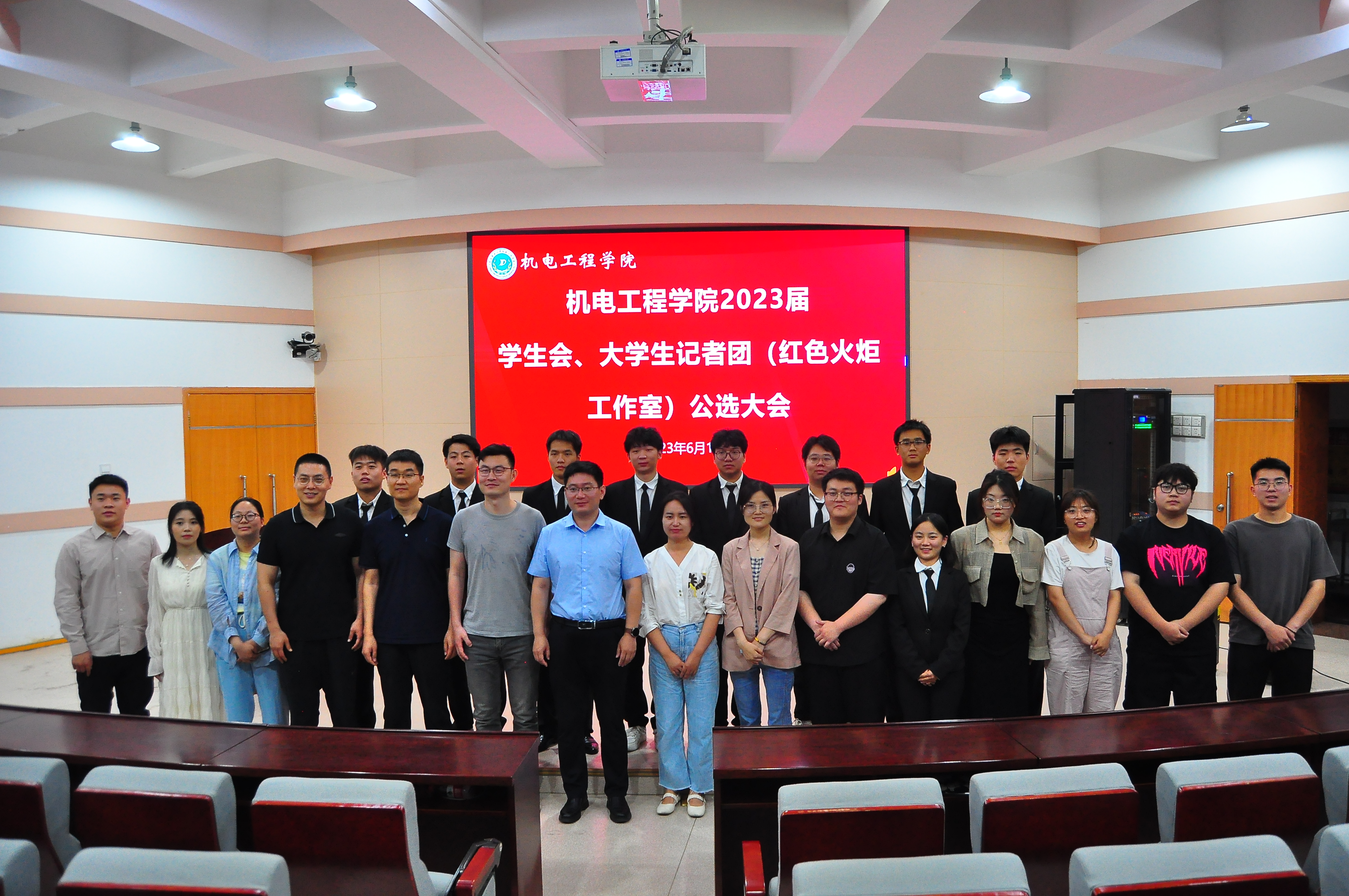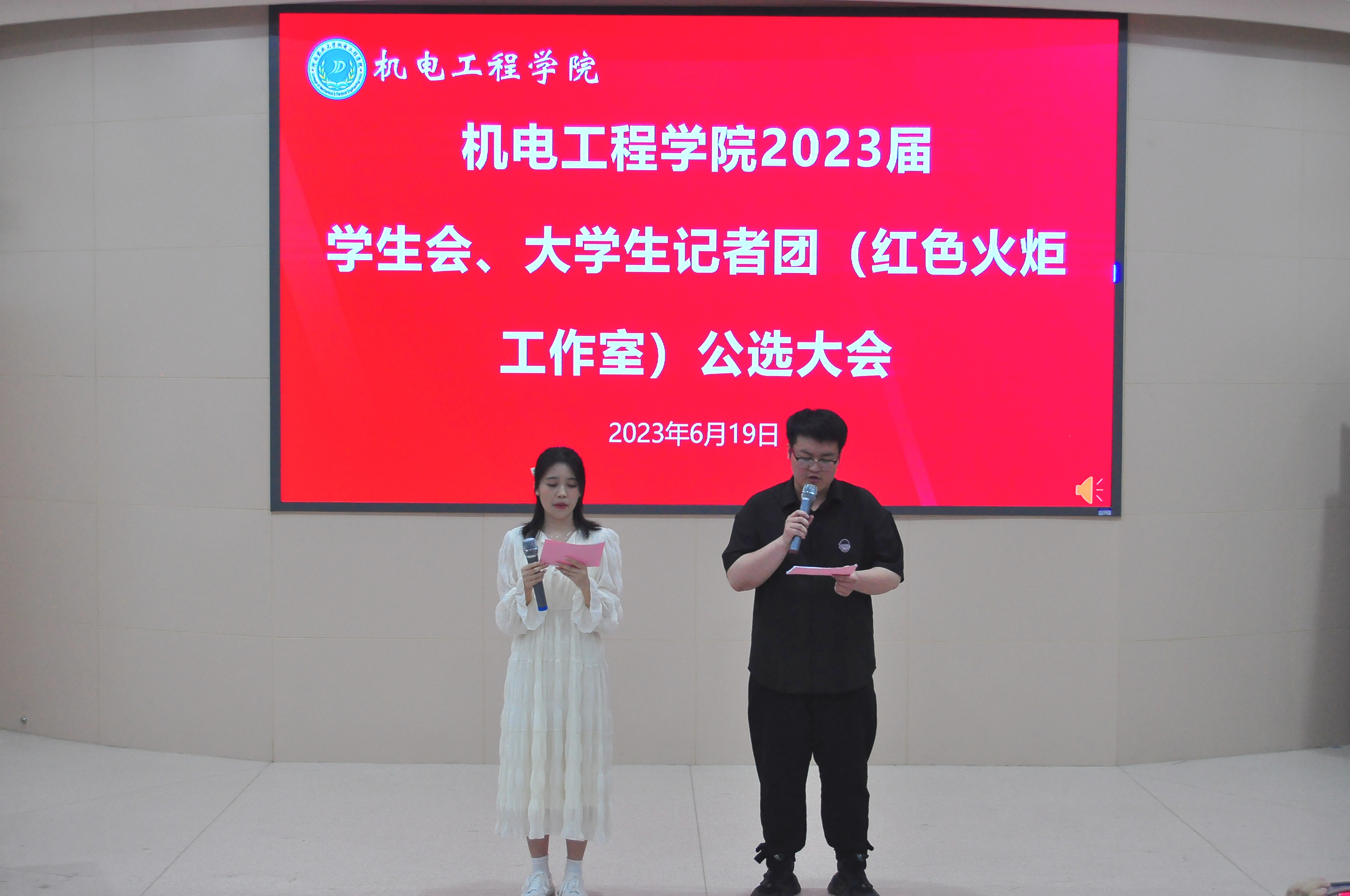 于文化路校区300人报告厅举行院学生会和大学生记者团(红色火炬工作室)公选大会。院团委书记黄笑,团委副书记王晓楠、胡亭亭,年级辅导员孙改革和兼职辅导员出席本次会议,21、22级班长支书及学生组织成员参加会议。